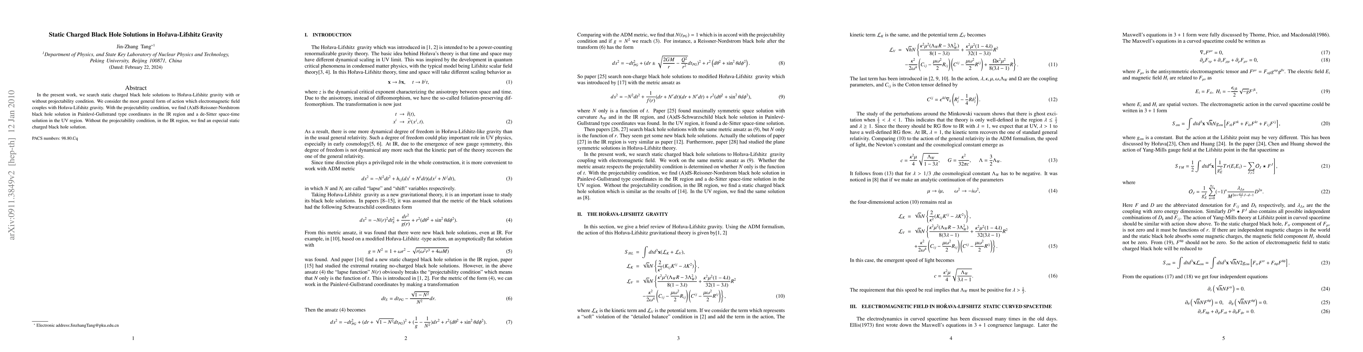 In the present work, we search static charged black hole solutions to Ho\v{r}ava-Lifshitz gravity with or without projectability condition. We consider the most general form of action which electromagnetic field couples with Ho\v{r}ava-Lifshitz gravity. With the projectability condition, we find dS-Reissner-Nordstrom black hole solution in Painlev\'e-Gullstrand type coordinates in the IR region and a de-Sitter space-time solution in the UV region. Without the projectability condition, in the IR region, we find an especial static charged black hole solution.