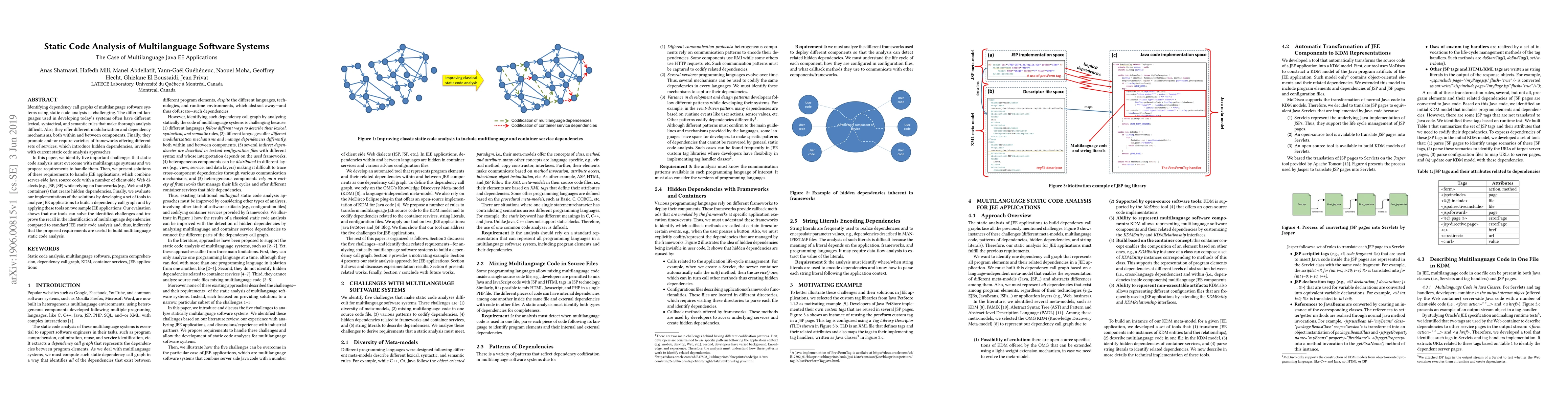 This paper identifies five key challenges in static code analysis of multilanguage software systems, proposing requirements and solutions to handle these challenges, particularly for JEE applications combining Java and web dialects. The evaluation of developed tools shows improved recall in identifying multilanguage dependencies compared to standard analysis methods.