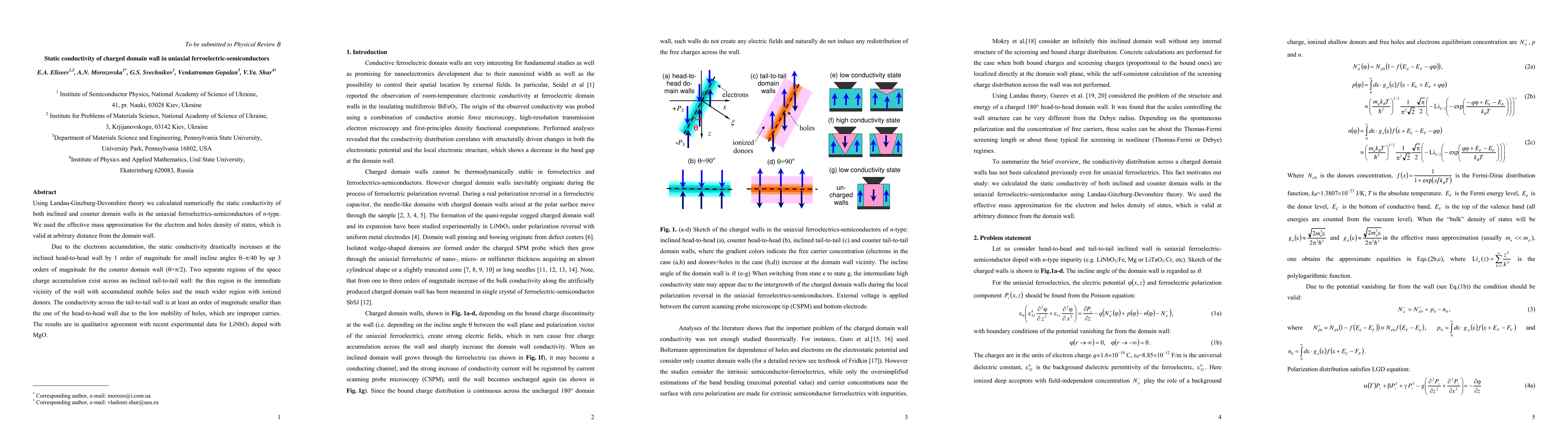 This study numerically calculates the static conductivity of charged domain walls in uniaxial ferroelectric-semiconductors using Landau-Ginzburg-Devonshire theory, revealing significant conductivity increases at inclined head-to-head walls and lower conductivity at tail-to-tail walls due to hole mobility differences. The findings align with recent experimental observations in MgO-doped LiNbO3.