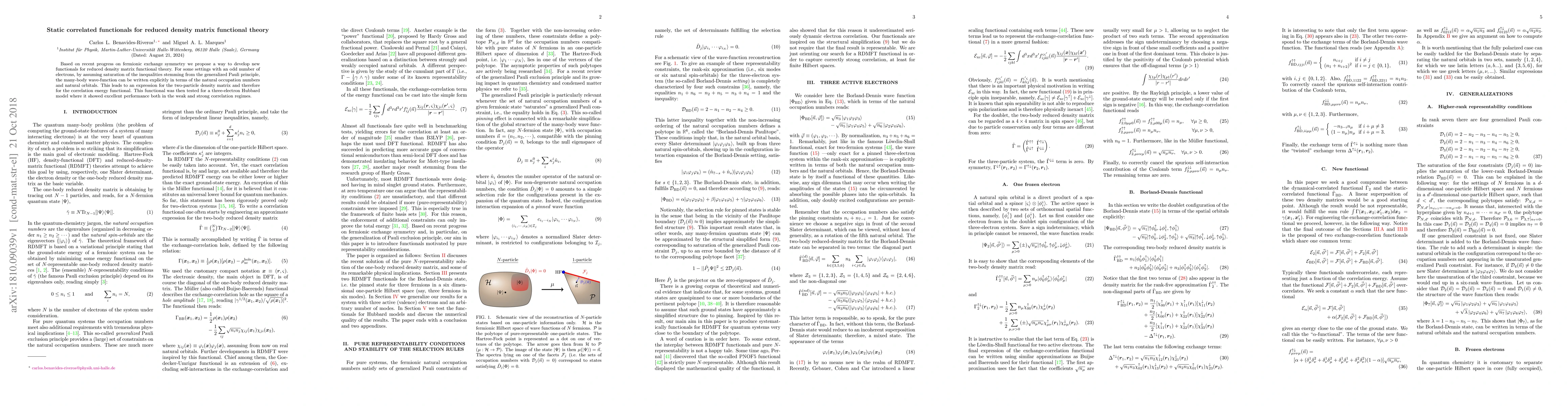 This paper proposes new static correlated functionals for reduced density matrix functional theory based on fermionic exchange symmetry. It demonstrates excellent performance in predicting correlation energy for a three-electron Hubbard model across both weak and strong correlation regimes.