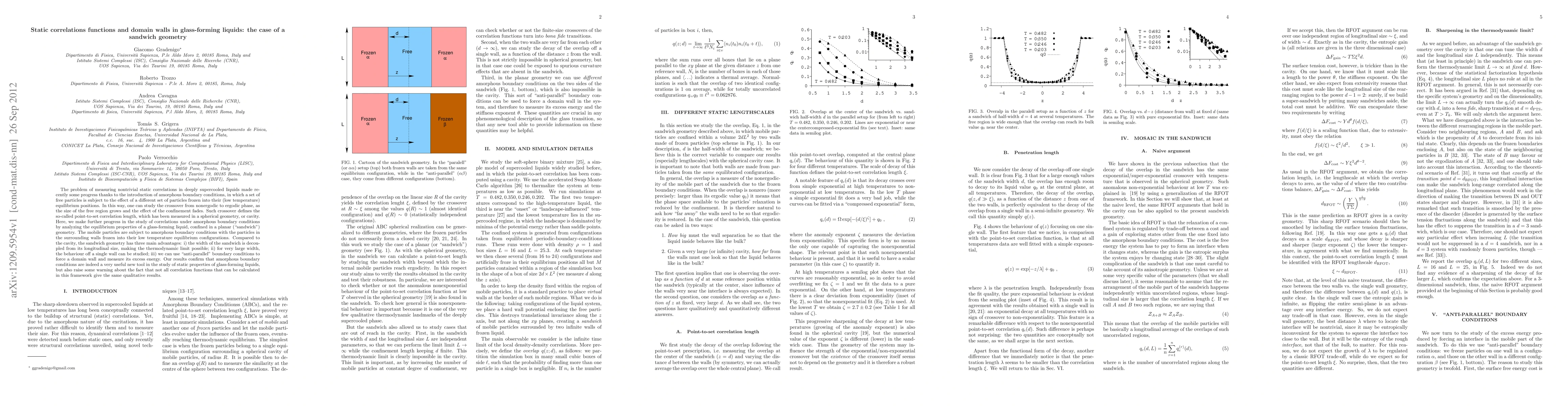 The problem of measuring nontrivial static correlations in deeply supercooled liquids made recently some progress thanks to the introduction of amorphous boundary conditions, in which a set of free particles is subject to the effect of a different set of particles frozen into their (low temperature) equilibrium positions. In this way, one can study the crossover from nonergodic to ergodic phase, as the size of the free region grows and the effect of the confinement fades. Such crossover defines the so-called point-to-set correlation length, which has been measured in a spherical geometry, or cavity. Here, we make further progress in the study ofcorrelations under amorphous boundary conditions by analyzing the equilibrium properties of a glass-forming liquid, confined in a planar ("sandwich") geometry. The mobile particles are subject to amorphous boundary conditions with the particles in the surrounding walls frozen into their low temperature equilibrium configurations. Compared to the cavity, the sandwich geometry has three main advantages: i) the width of the sandwich is decoupled from its longitudinal size, making the thermodynamic limit possible; ii) for very large width, the behaviour off a single wall can be studied; iii) we can use "anti-parallel" boundary conditions to force a domain wall and measure its excess energy. Our results confirm that amorphous boundary conditions are indeed a very useful new tool inthe study of static properties of glass-forming liquids, but also raise some warning about the fact that not all correlation functions that can be calculated in this framework give the same qualitative results.