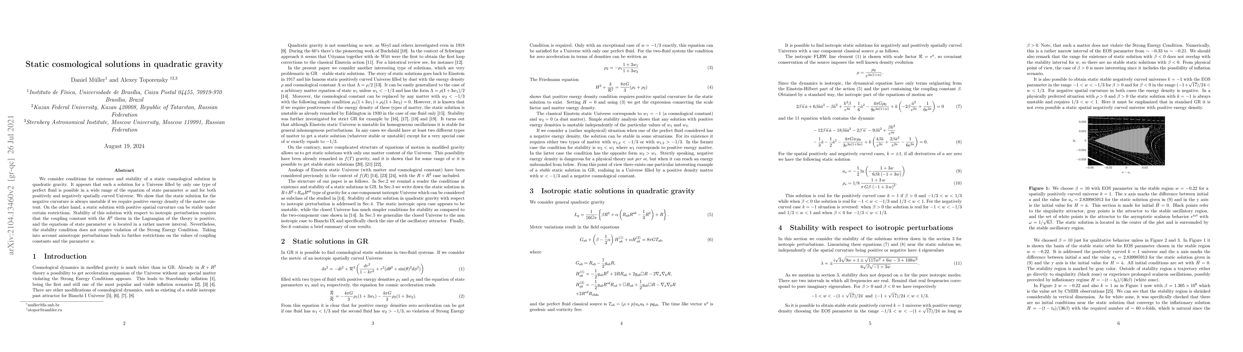 We consider conditions for existence and stability of a static cosmological solution in quadratic gravity. It appears that such a solution for a Universe filled by only one type of perfect fluid is possible in a wide range of the equation of state parameter $w$ and for both positively and negatively spatially curved Universe. We show that the static solution for the negative curvature is always unstable if we require positive energy density of the matter content. On the other hand, a static solution with positive spatial curvature can be stable under certain restrictions. Stability of this solution with respect to isotropic perturbation requires that the coupling constant with the $R^2$ therm in the Lagrangian of the theory is positive, and the equations of state parameter $w$ is located in a rather narrow interval. Nevertheless, the stability condition does not require violation of the Strong Energy Condition. Taking into account anisotropic perturbations leads to further restrictions on the values of coupling constants and the parameter $w$.