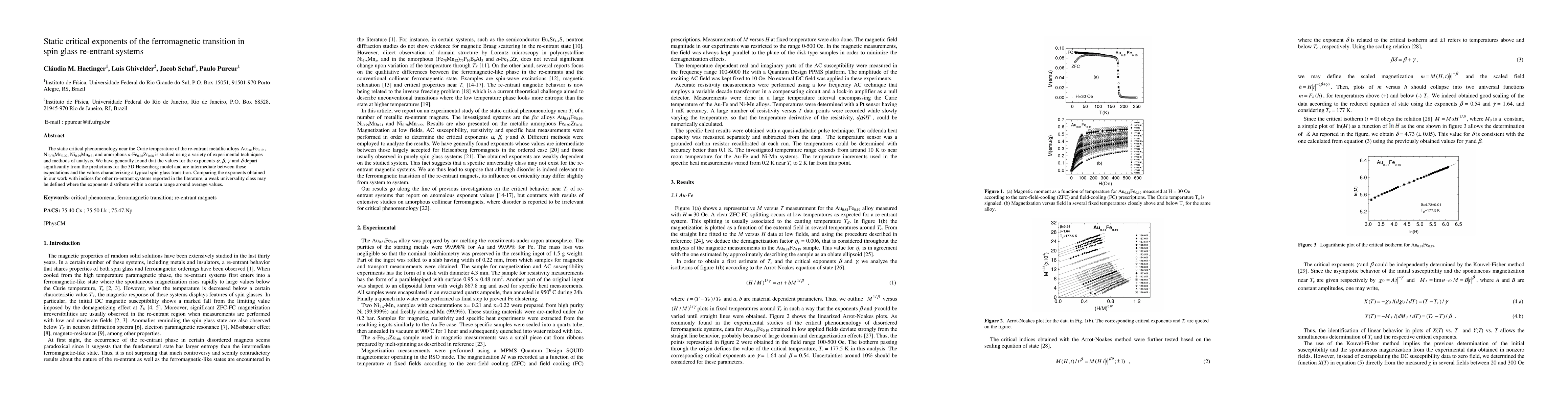 The static critical phenomenology near the Curie temperature of the re-entrant metallic alloys Au_0.81Fe_0.19, Ni_0.78Mn_0.22, Ni_0.79Mn_0.21 and amorphous a-Fe_0.98Zr_0.08 is studied using a variety of experimental techniques and methods of analysis. We have generally found that the values for the exponents alpha, beta, gamma and delta depart significantly from the predictions for the 3D Heisenberg model and are intermediate between these expectations and the values characterizing a typical spin glass transition. Comparing the exponents obtained in our work with indices for other re-entrant systems reported in the literature, a weak universality class may be defined where the exponents distribute within a certain range around average values.