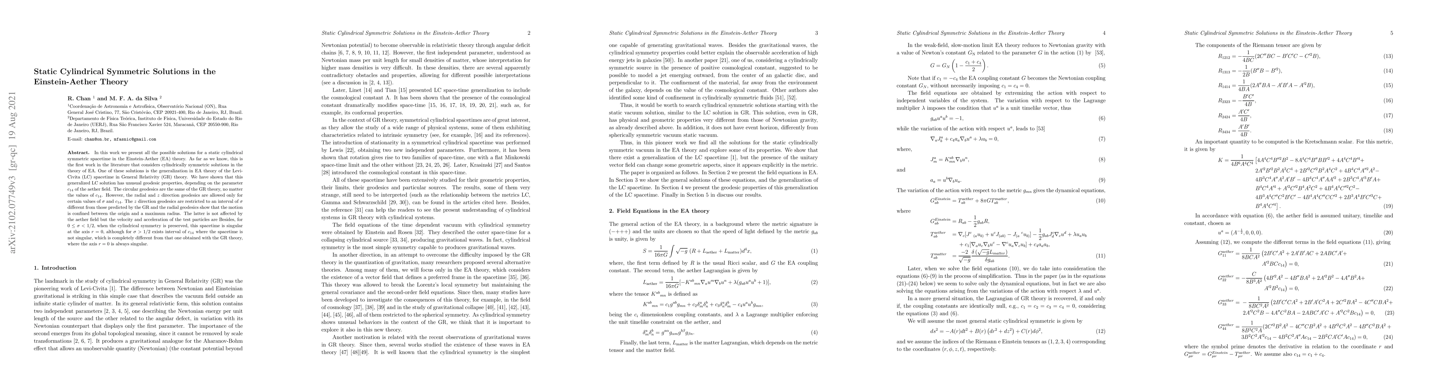 This paper presents the first comprehensive analysis of static cylindrical symmetric solutions in the Einstein-Aether theory, revealing a generalized Levi-Civita spacetime with unique geodesic properties dependent on the aether field parameter. Unlike General Relativity, these solutions show restricted geodesics in the radial and z directions, and exhibit singularities or non-singularity depending on the values of the parameters.
