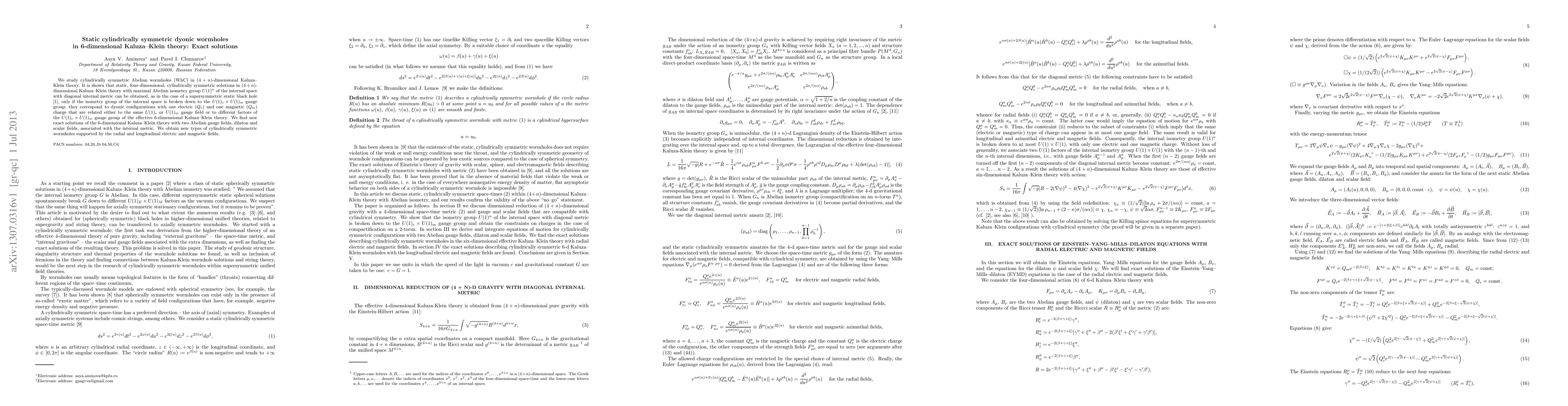 This paper investigates static, cylindrically symmetric dyonic wormholes in 6-dimensional Kaluza-Klein theory, revealing new exact solutions corresponding to wormholes supported by radial and longitudinal electric and magnetic fields, with one electric and one magnetic charge. The solutions arise when the maximal Abelian isometry group is reduced to $U (1)_e \times U(1)_m$.