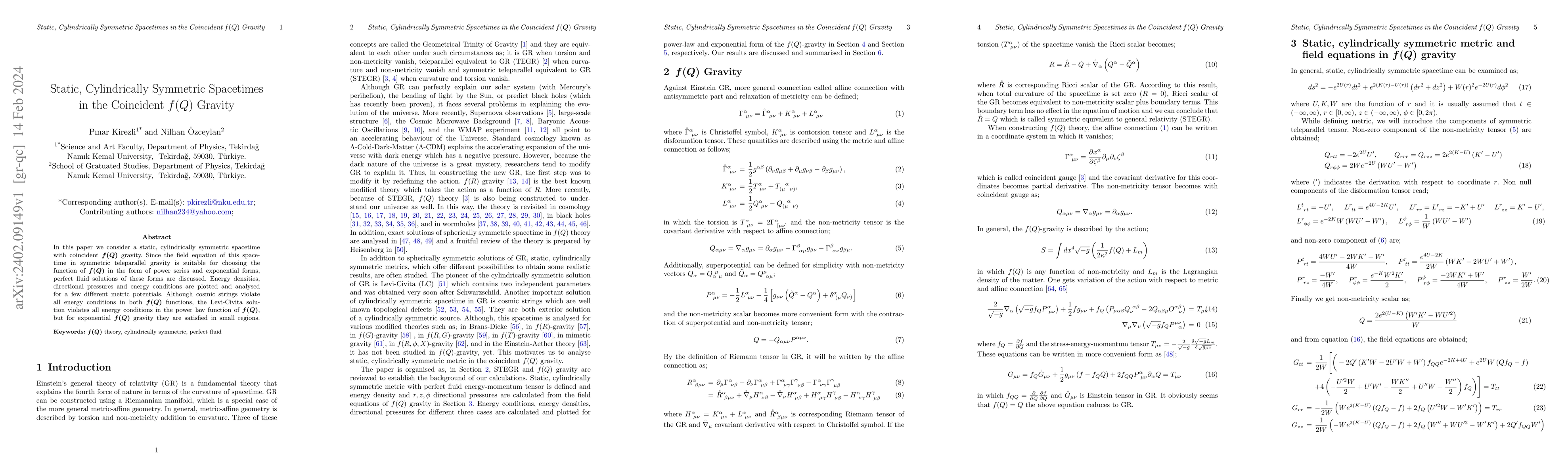 This paper investigates static, cylindrically symmetric spacetimes within the framework of coincident f(Q) gravity, exploring perfect fluid solutions and their associated energy densities and pressures. While cosmic strings violate all energy conditions, the Levi-Civita solution exhibits mixed behavior depending on the form of f(Q), satisfying conditions in exponential forms but not in power law forms.