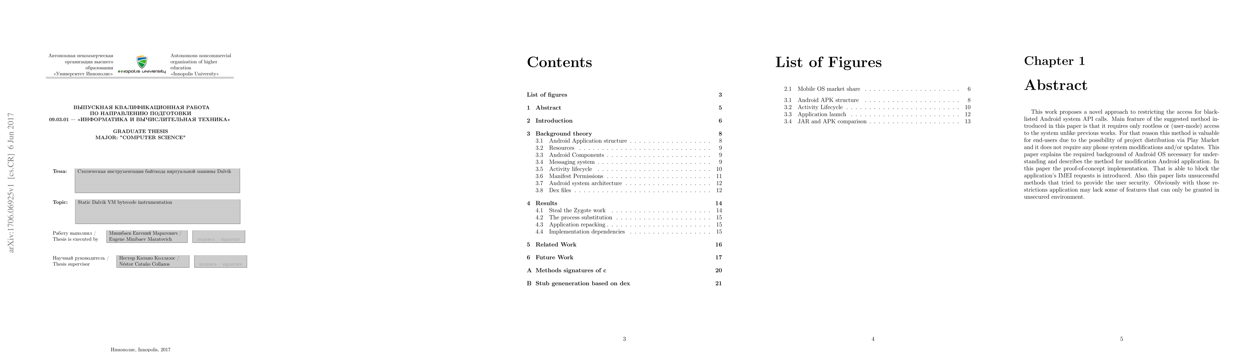 This work proposes a novel approach to restricting the access for blacklisted Android system API calls. Main feature of the suggested method introduced in this paper is that it requires only rootless or (user-mode) access to the system unlike previous works. For that reason this method is valuable for end-users due to the possibility of project distribution via Play Market and it does not require any phone system modifications and/or updates. This paper explains the required background of Android OS necessary for understanding and describes the method for modification Android application. In this paper the proof-of-concept implementation. That is able to block the application's IMEI requests is introduced. Also this paper lists unsuccessful methods that tried to provide the user security. Obviously with those restrictions application may lack some of features that can only be granted in unsecured environment.