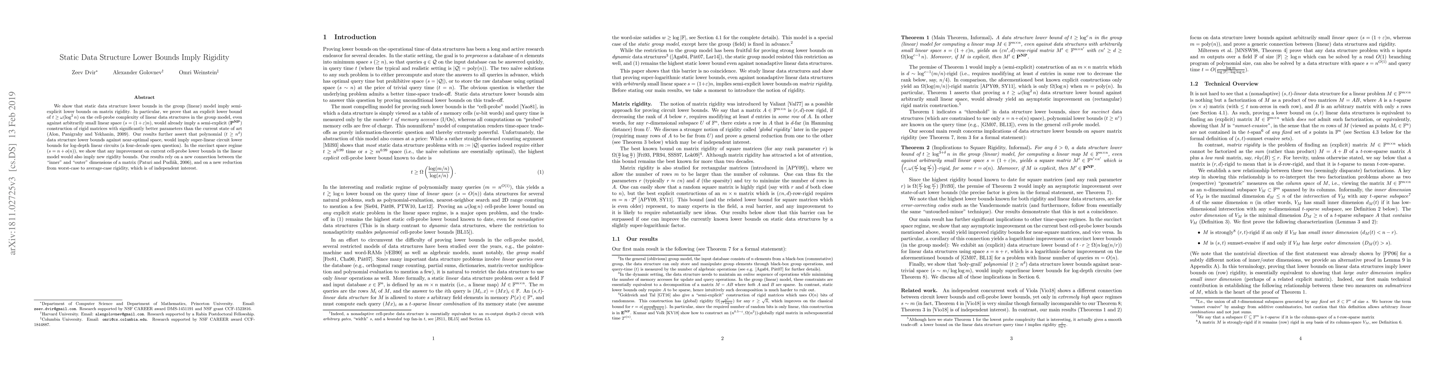 This paper demonstrates that static data structure lower bounds in the group model imply significant lower bounds on matrix rigidity and super-linear circuit lower bounds for log-depth linear circuits. It establishes a new connection between matrix dimensions and a reduction from worst-case to average-case rigidity.