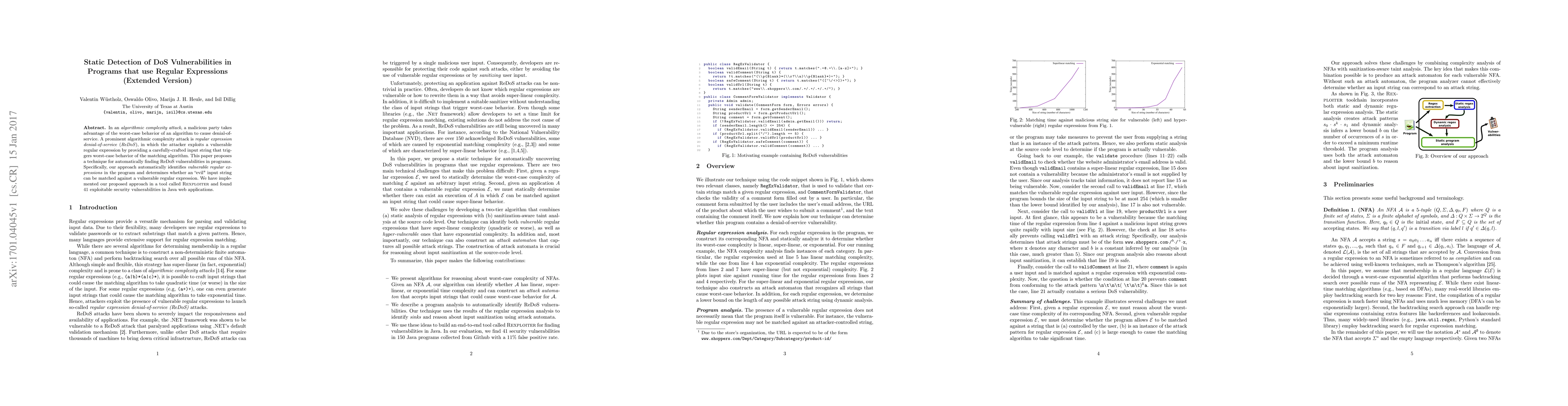 This paper proposes a technique to automatically detect regular expression denial-of-service (ReDoS) vulnerabilities in programs by identifying vulnerable regular expressions and determining if they can be exploited with crafted input strings. The authors implemented their method in a tool called REXPLOITER, which identified 41 exploitable vulnerabilities in Java web applications.