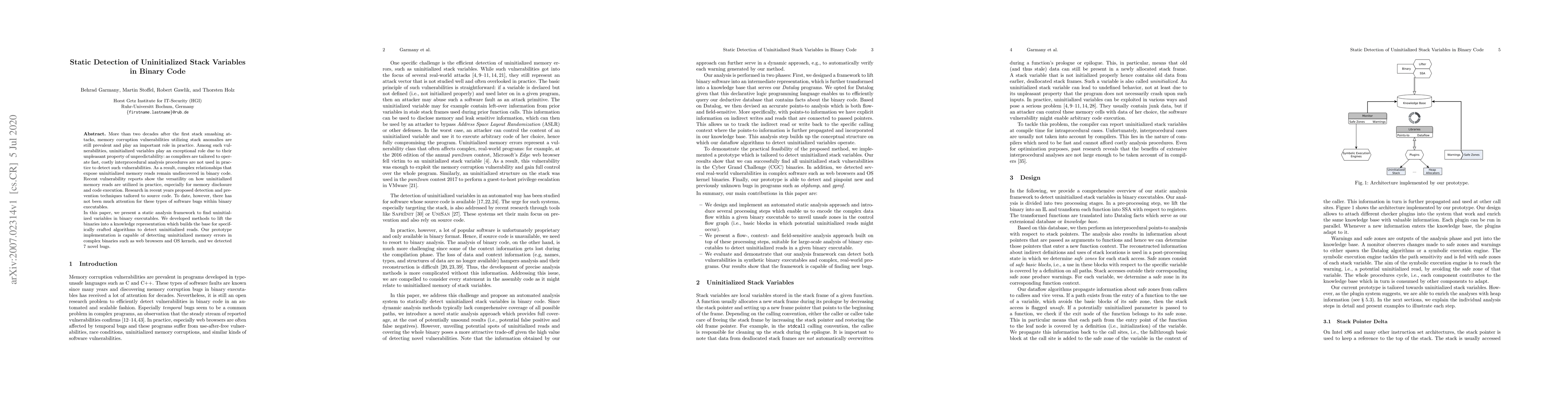 This paper introduces a static analysis framework to detect uninitialized stack variables in binary code, addressing prevalent memory corruption vulnerabilities. The authors developed methods to lift binaries into a knowledge representation, enabling the detection of uninitialized reads, and demonstrated its effectiveness through a prototype capable of identifying 7 novel bugs in complex binaries.