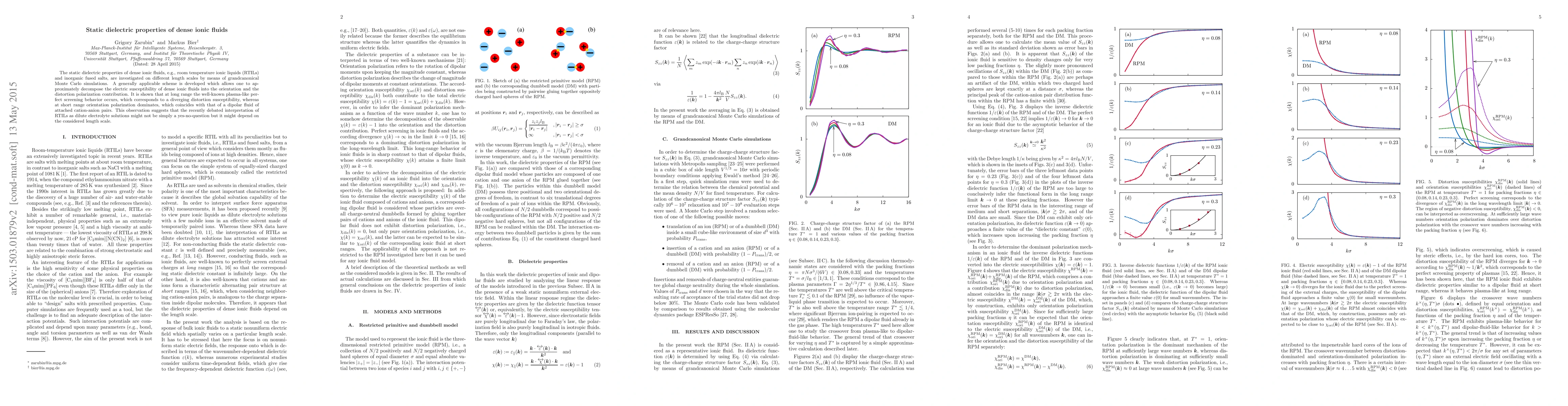 This paper investigates the static dielectric properties of dense ionic fluids using grandcanonical Monte Carlo simulations, revealing that long-range behavior exhibits perfect screening due to distortion polarization, while short-range orientation polarization dominates, suggesting length scale dependency in interpreting room temperature ionic liquids as dilute electrolyte solutions.