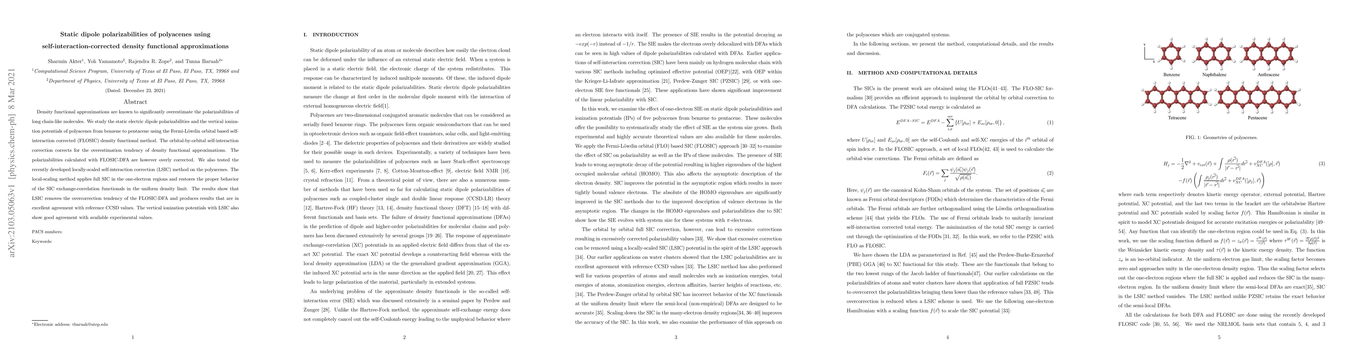 This paper investigates the static dipole polarizabilities of polyacenes using self-interaction-corrected density functional approximations, finding that the locally-scaled self-interaction correction (LSIC) method provides results that closely match reference CCSD values and experimental ionization potentials. The LSIC method corrects the overestimation issue of traditional density functional approximations.