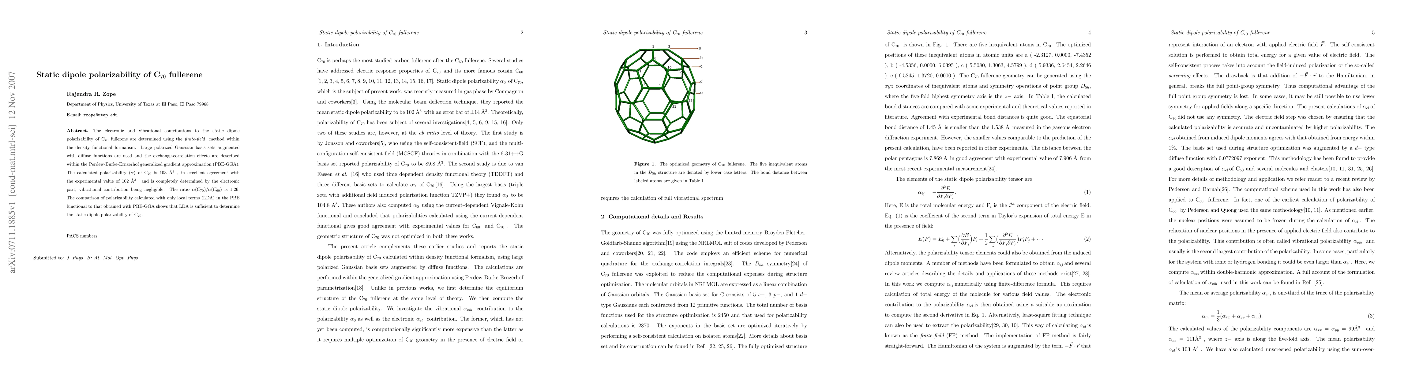 This paper calculates the static dipole polarizability of C70 fullerene using the finite-field method within density functional theory, finding it to be 103 Angstrom^3, closely matching the experimental value. The electronic contribution dominates, with negligible vibrational effects.