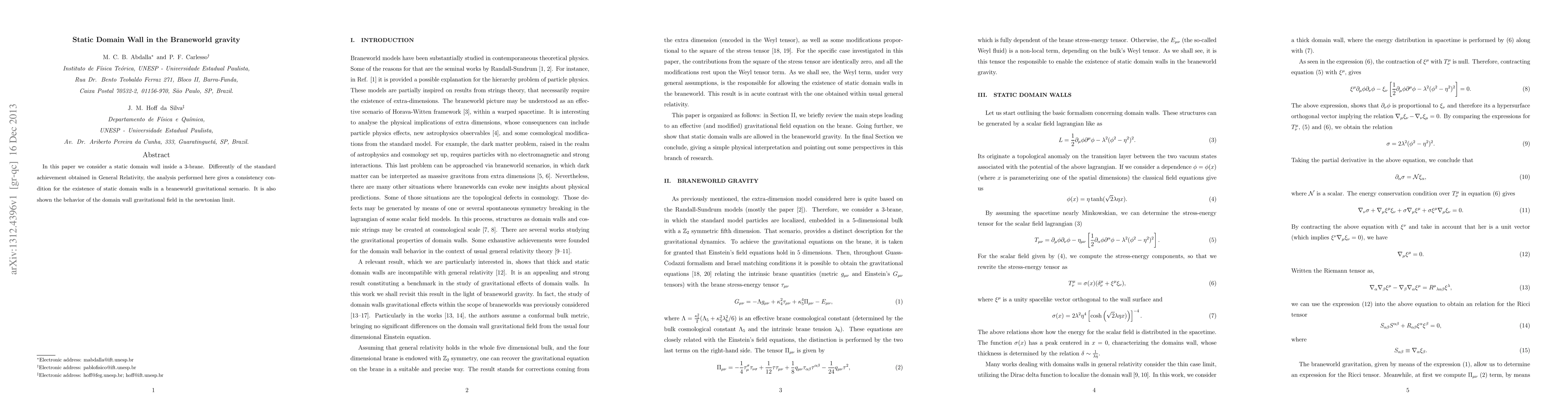 In this paper we consider a static domain wall inside a 3-brane. Differently of the standard achievement obtained in General Relativity, the analysis performed here gives a consistency condition for the existence of static domain walls in a braneworld gravitational scenario. It is also shown the behavior of the domain wall gravitational field in the newtonian limit.