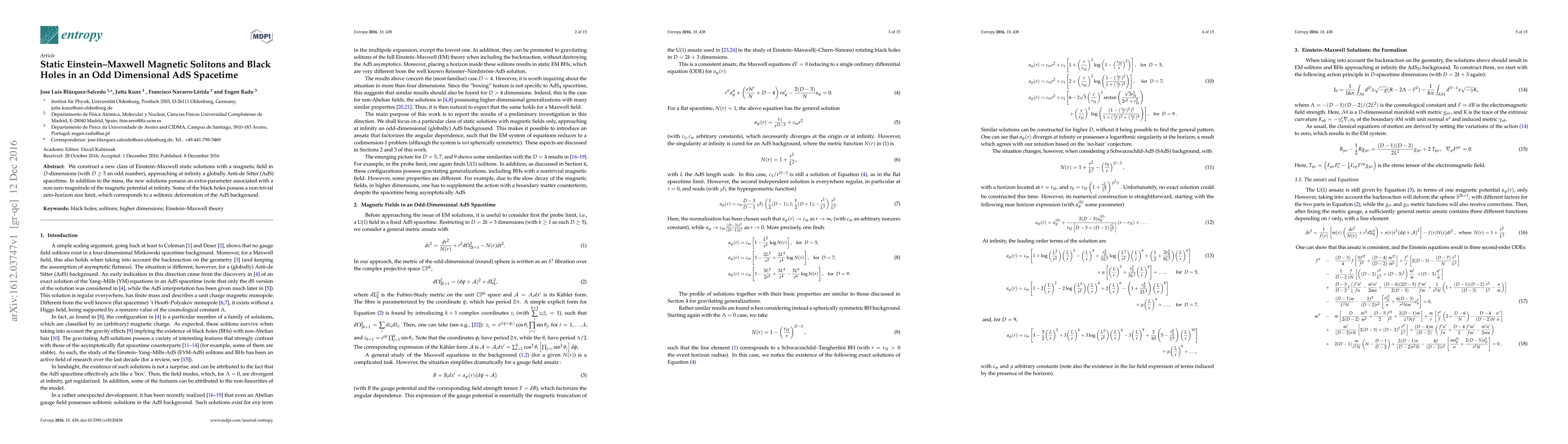 This paper constructs static Einstein-Maxwell solutions in odd-dimensional AdS spacetimes with magnetic fields, introducing a new parameter linked to the magnetic potential at infinity. Some black holes exhibit solitonic deformations with zero-horizon size limits.