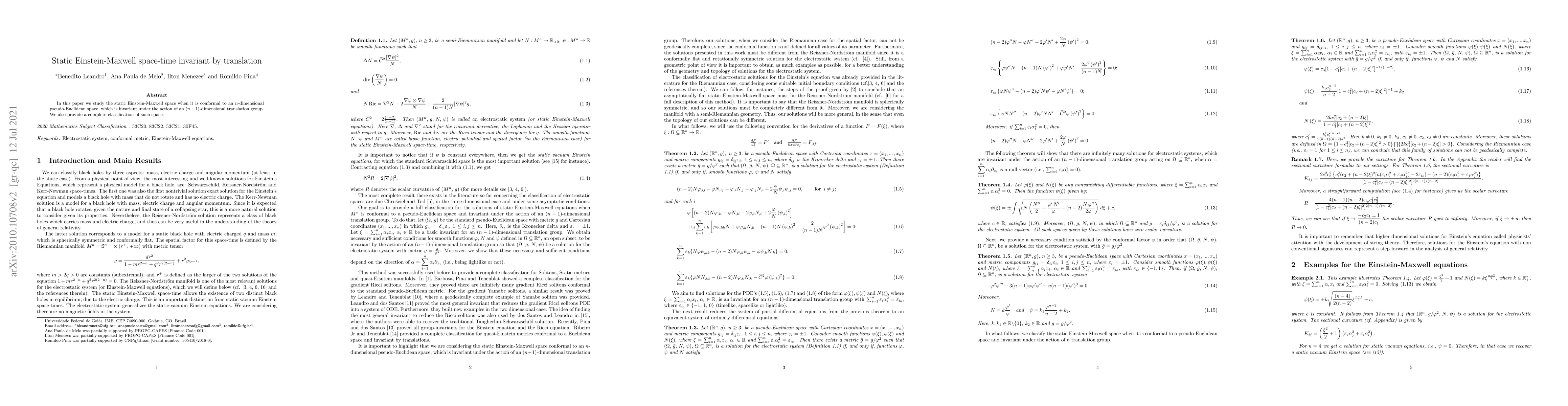 This research classifies static Einstein-Maxwell space-time invariant under translation in n-dimensional pseudo-Euclidean space, demonstrating conformal equivalence and providing a comprehensive categorization.