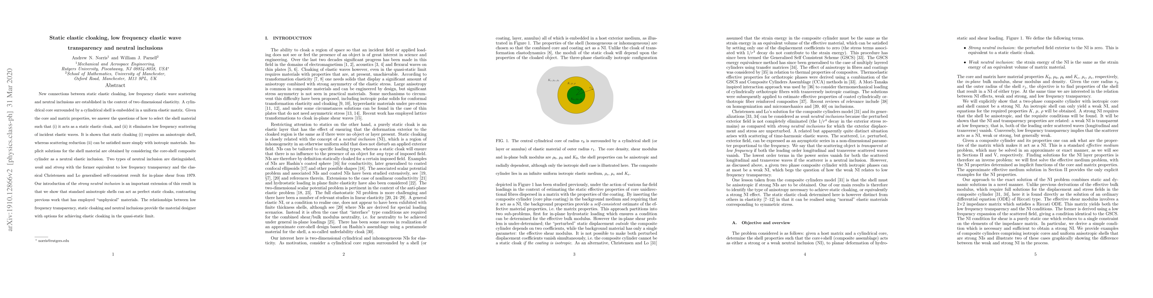 This paper establishes new connections between static elastic cloaking, low frequency elastic wave scattering, and neutral inclusions in 2D elasticity. It demonstrates that static cloaking requires anisotropic shell materials, while low frequency scattering can be reduced with isotropic materials, providing material designers with options for achieving elastic cloaking.