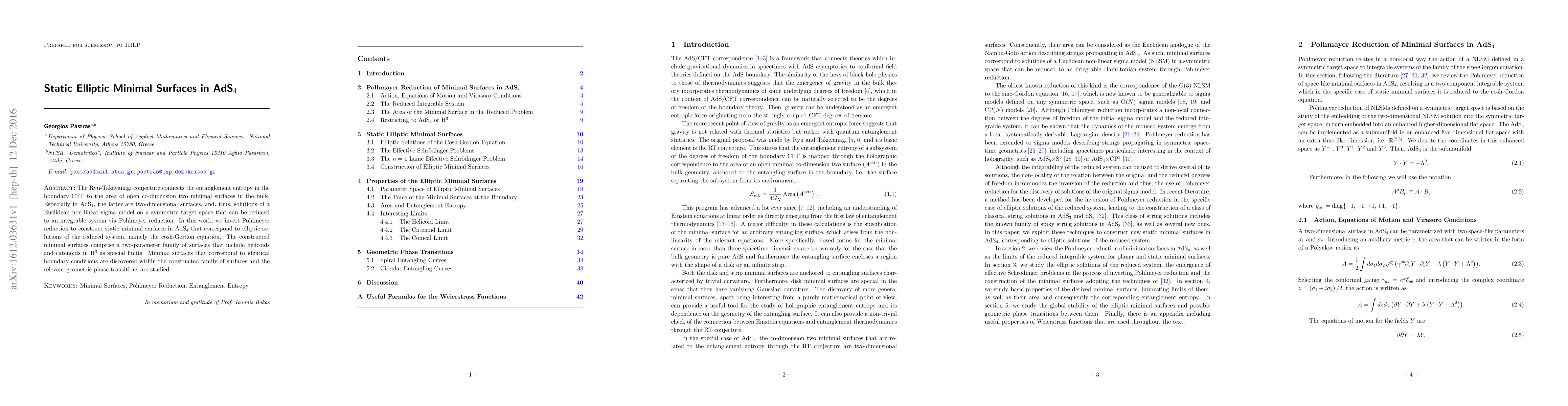 This paper constructs static elliptic minimal surfaces in AdS(4) by inverting Pohlmeyer reduction, resulting in a two-parameter family of surfaces that includes helicoids and catenoids. The study also examines geometric phase transitions between minimal surfaces with identical boundary conditions.