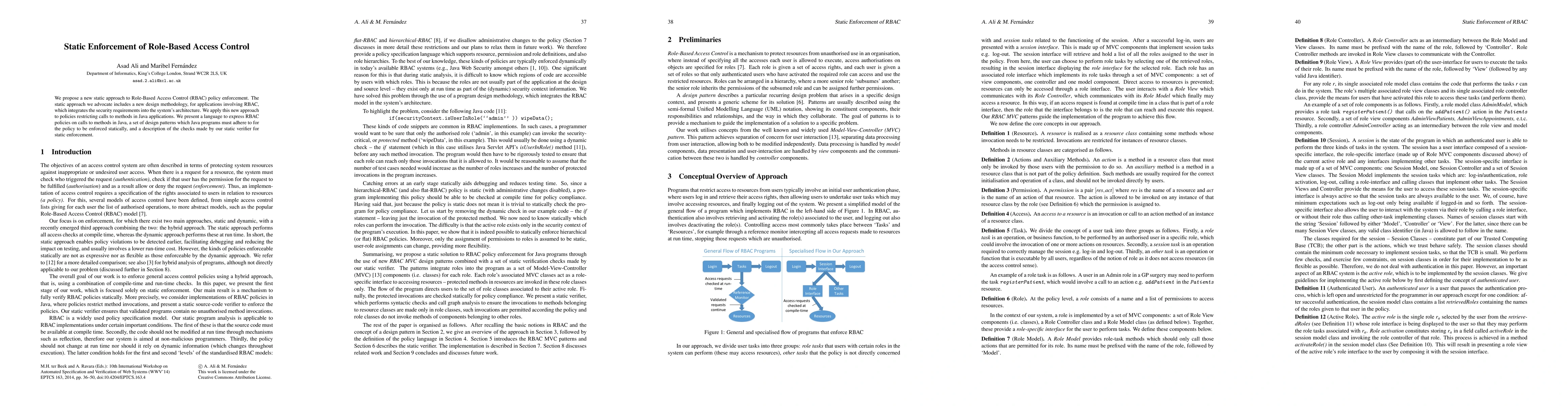 This paper proposes a static enforcement methodology for Role-Based Access Control (RBAC) in Java applications, integrating security requirements into the system architecture. It includes a language for expressing RBAC policies, design patterns for Java programs, and a static verifier for policy enforcement.