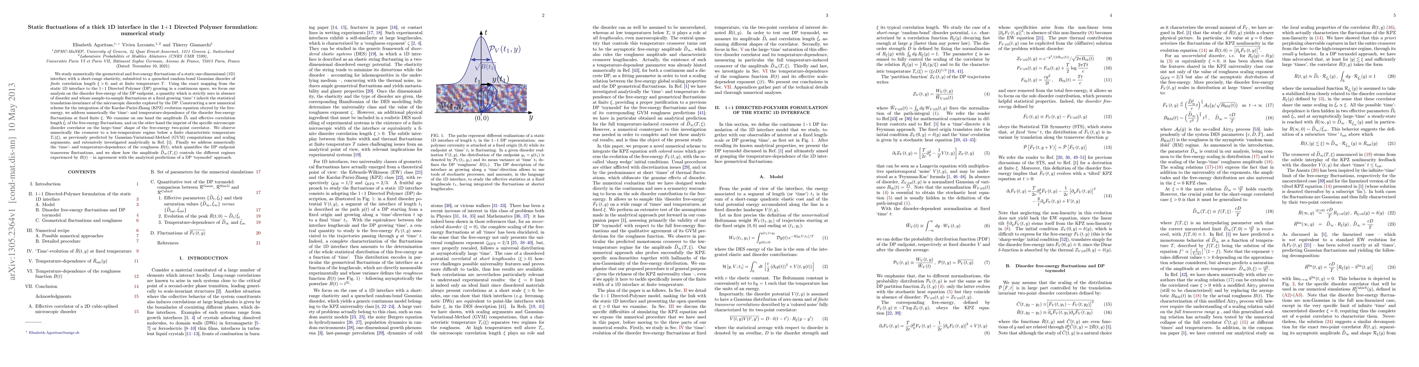 This study numerically investigates the geometrical and free-energy fluctuations of a static 1D interface in the context of the 1+1 Directed Polymer formulation, revealing a crossover to a low-temperature regime at a characteristic temperature $T_c(\xi)$.