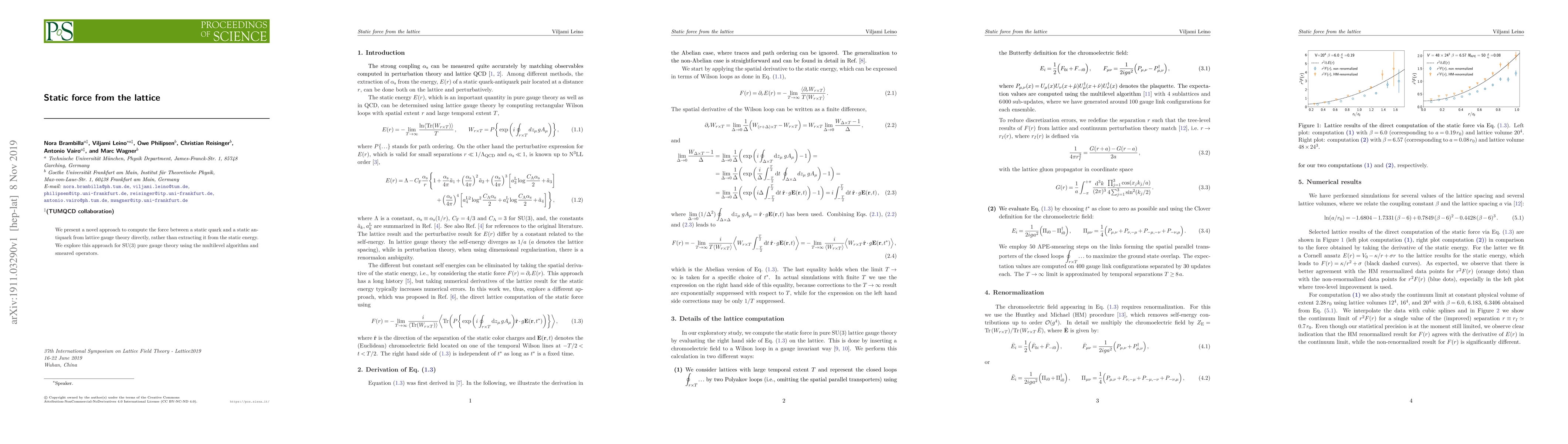 We present a novel approach to compute the force between a static quark and a static antiquark from lattice gauge theory directly, rather than extracting it from the static energy. We explore this approach for SU(3) pure gauge theory using the multilevel algorithm and smeared operators.