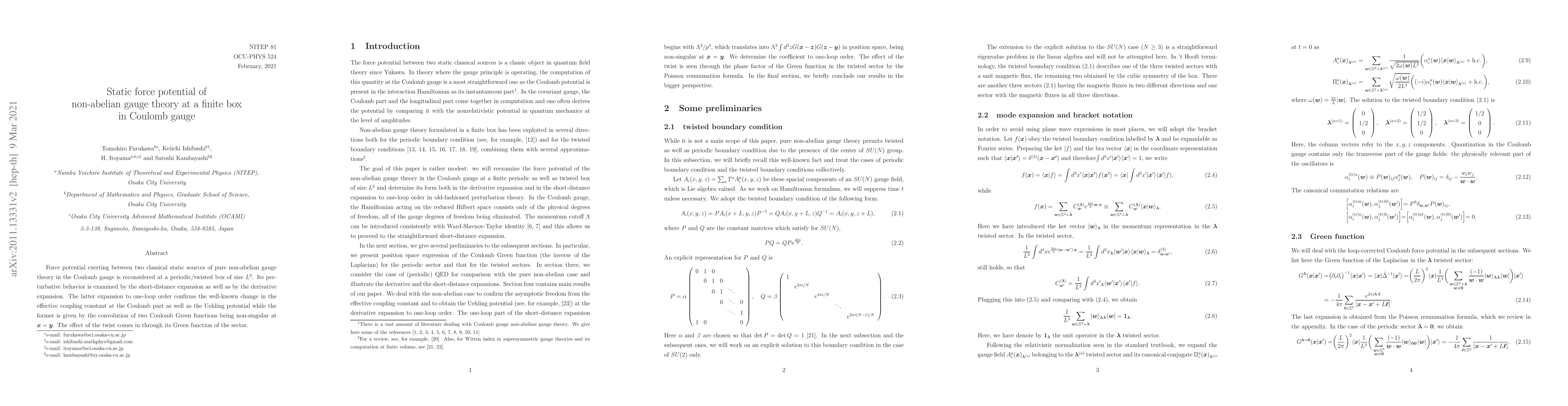 Force potential exerting between two classical static sources of pure non-abelian gauge theory in the Coulomb gauge is reconsidered at a periodic/twisted box of size $L^3$. Its perturbative behavior is examined by the short-distance expansion as well as by the derivative expansion. The latter expansion to one-loop order confirms the well-known change in the effective coupling constant at the Coulomb part as well as the Uehling potential while the former is given by the convolution of two Coulomb Green functions being non-singular at $\bm{x}=\bm{y}$. The effect of the twist comes in through its Green function of the sector.