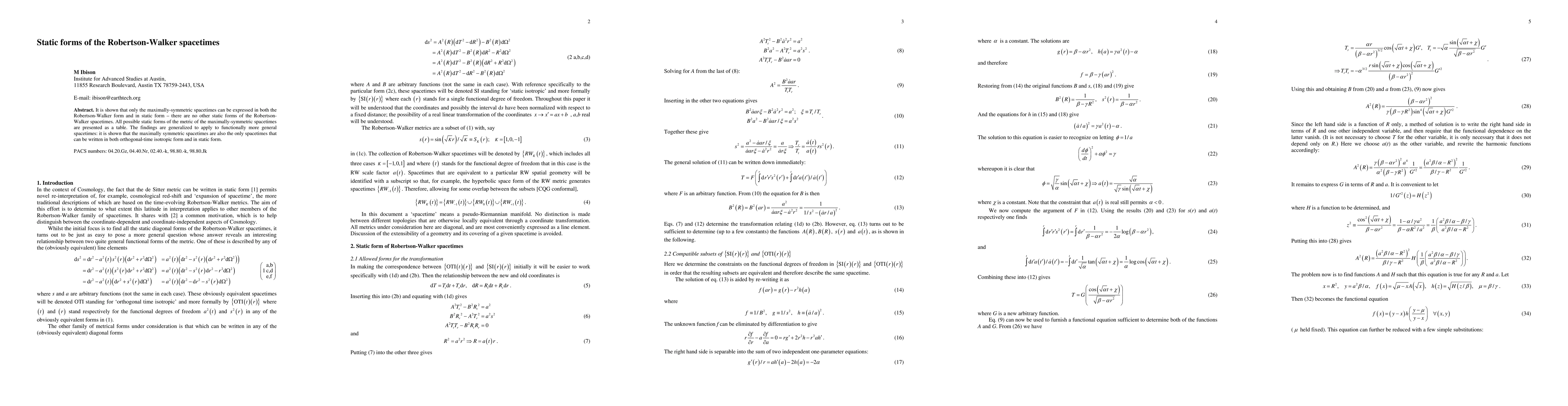 It is shown that only the maximally-symmetric spacetimes can be expressed in both the Robertson-Walker form and in static form - there are no other static forms of the Robertson-Walker spacetimes. All possible static forms of the metric of the maximally-symmetric spacetimes are presented as a table. The findings are generalized to apply to functionally more general spacetimes: it is shown that the maximally symmetric spacetimes are also the only spacetimes that can be written in both orthogonal-time isotropic form and in static form.