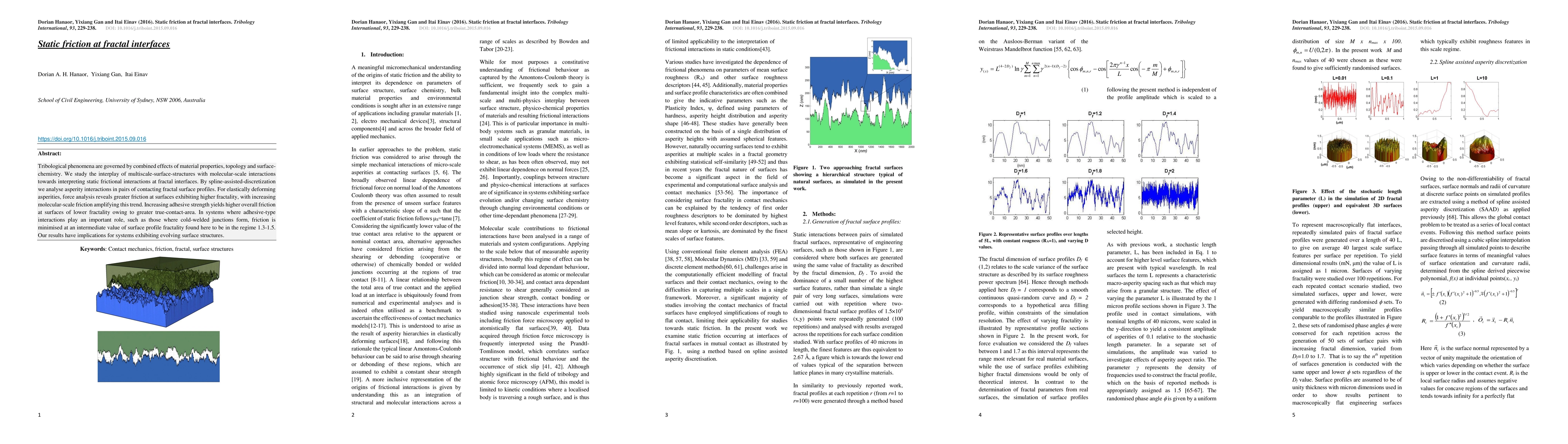This study investigates static friction at fractal interfaces, revealing that higher fractality correlates with greater friction due to increased molecular-scale interactions. Conversely, lower fractality surfaces show higher friction when adhesive strength is significant, minimizing friction at intermediate fractality values around 1.3 to 1.5.