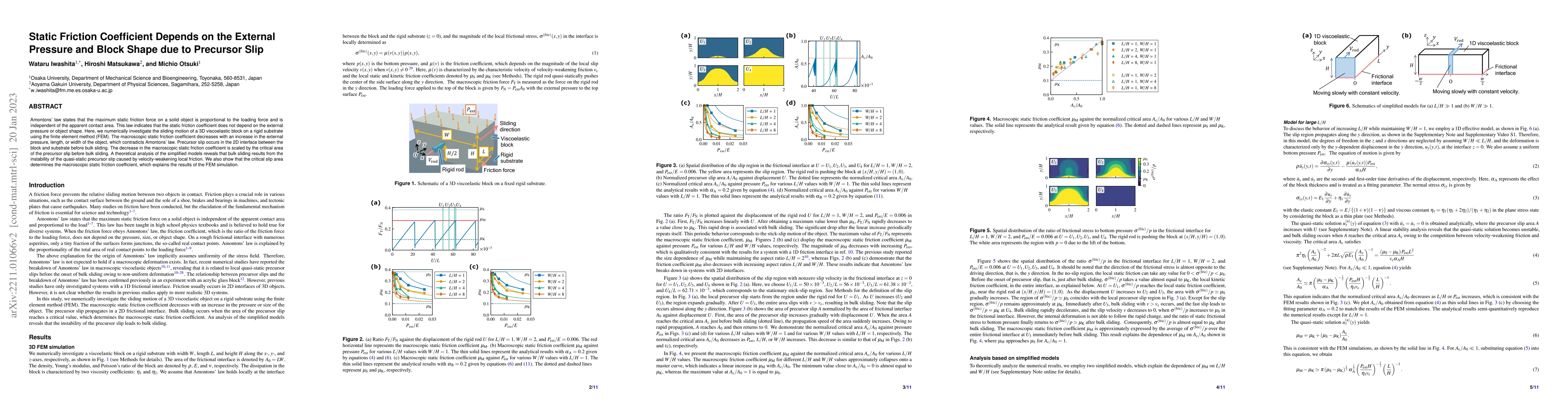 This research investigates how the static friction coefficient varies with external pressure and block shape, challenging Amontons' law. Numerical simulations using FEM reveal a decrease in the friction coefficient with increasing pressure and block dimensions, attributed to precursor slip instability before bulk sliding.