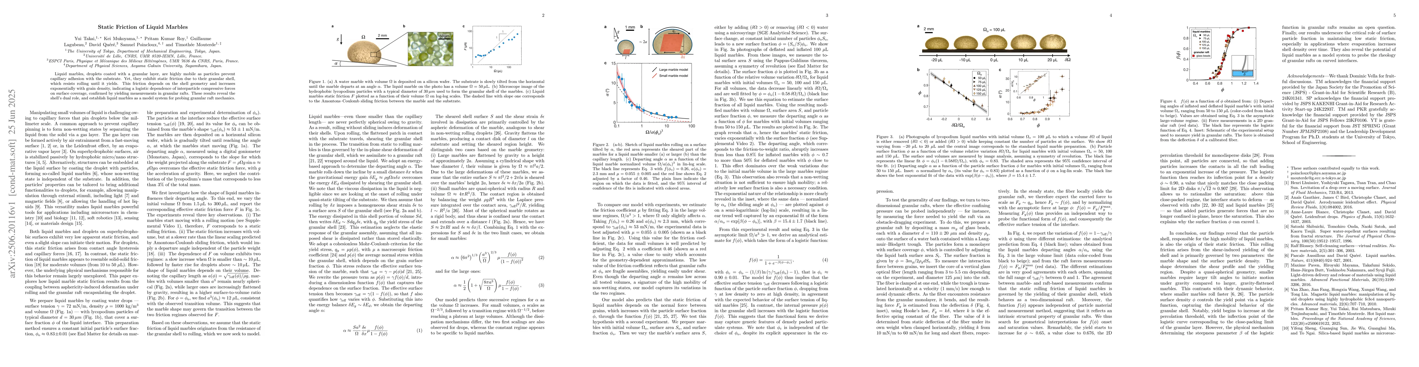 Liquid marbles, droplets coated with a granular layer, are highly mobile as particles prevent capillary adhesion with the substrate. Yet, they exhibit static friction due to their granular shell, which resists rolling until it yields. This friction depends on the shell geometry and increases exponentially with grain density, indicating a logistic dependence of interparticle compressive forces on surface coverage, confirmed by yielding measurements in granular rafts. These results reveal the shell's dual role, and establish liquid marbles as a model system for probing granular raft mechanics.