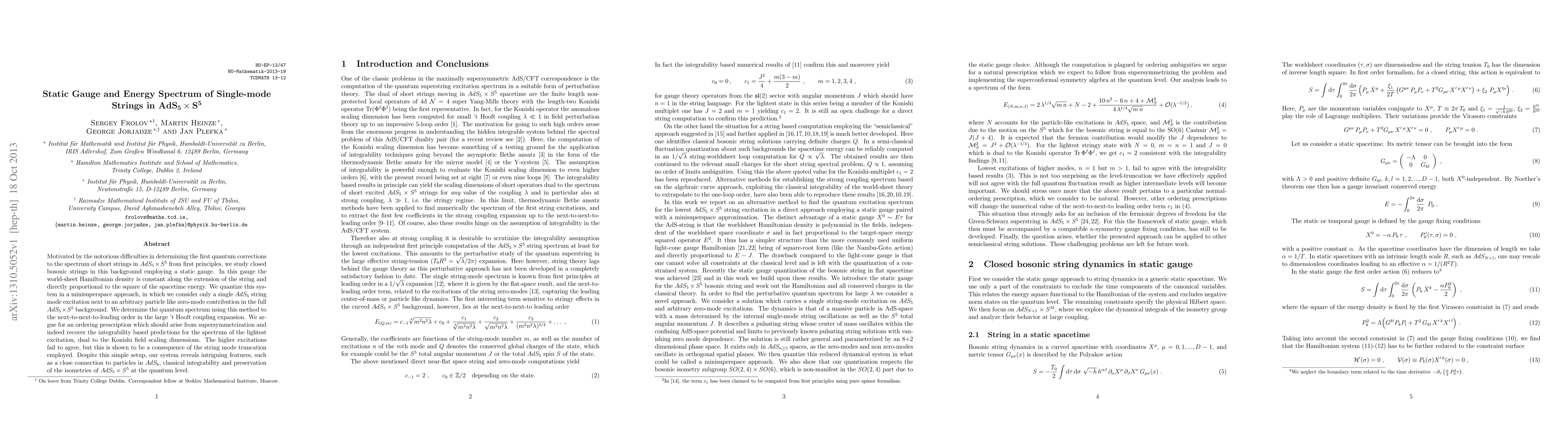 Motivated by the notorious difficulties in determining the first quantum corrections to the spectrum of short strings in AdS_5xS^5 from first principles, we study closed bosonic strings in this background employing a static gauge. In this gauge the world-sheet Hamiltonian density is constant along the extension of the string and directly proportional to the square of the spacetime energy. We quantize this system in a minisuperspace approach, in which we consider only a single AdS_5 string mode excitation next to an arbitrary particle like zero-mode contribution in the full AdS_5xS^5 background. We determine the quantum spectrum using this method to the next-to-next-to-leading order in the large 't Hooft coupling expansion. We argue for an ordering prescription which should arise from supersymmetrization and indeed recover the integrability based predictions for the spectrum of the lightest excitation, dual to the Konishi field scaling dimensions. The higher excitations fail to agree, but this is shown to be a consequence of the string mode truncation employed. Despite this simple setup, our system reveals intriguing features, such as a close connection to particles in AdS_6, classical integrability and preservation of the isometries of AdS_5xS^5 at the quantum level.
