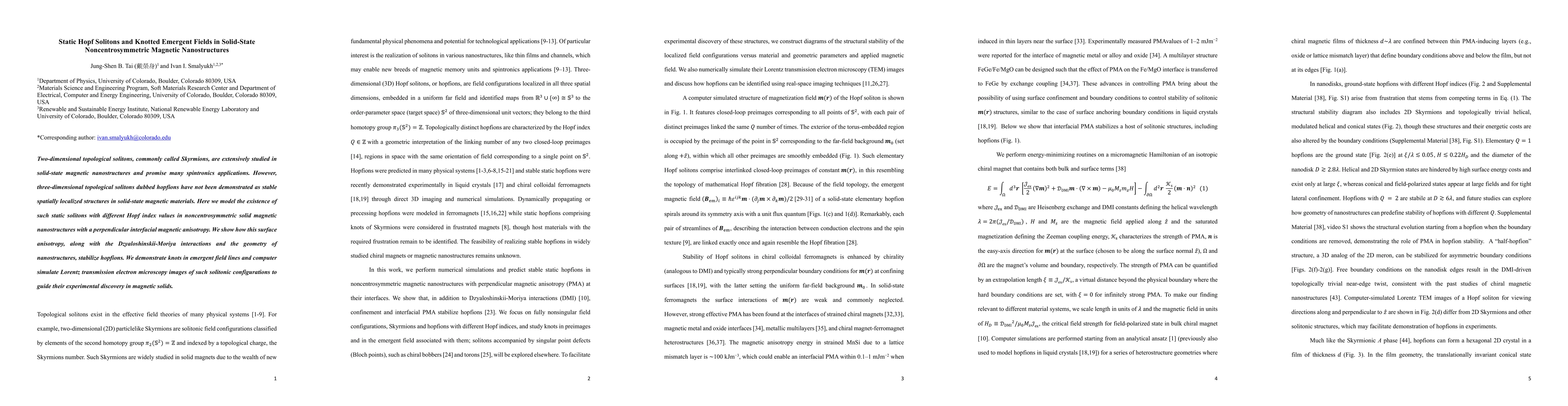 This paper models the existence of three-dimensional static Hopf solitons in noncentrosymmetric magnetic nanostructures, demonstrating their stabilization through surface anisotropy and Dzyaloshinskii-Moriya interactions. It also presents simulations of Lorentz transmission electron microscopy images to aid in their experimental discovery.