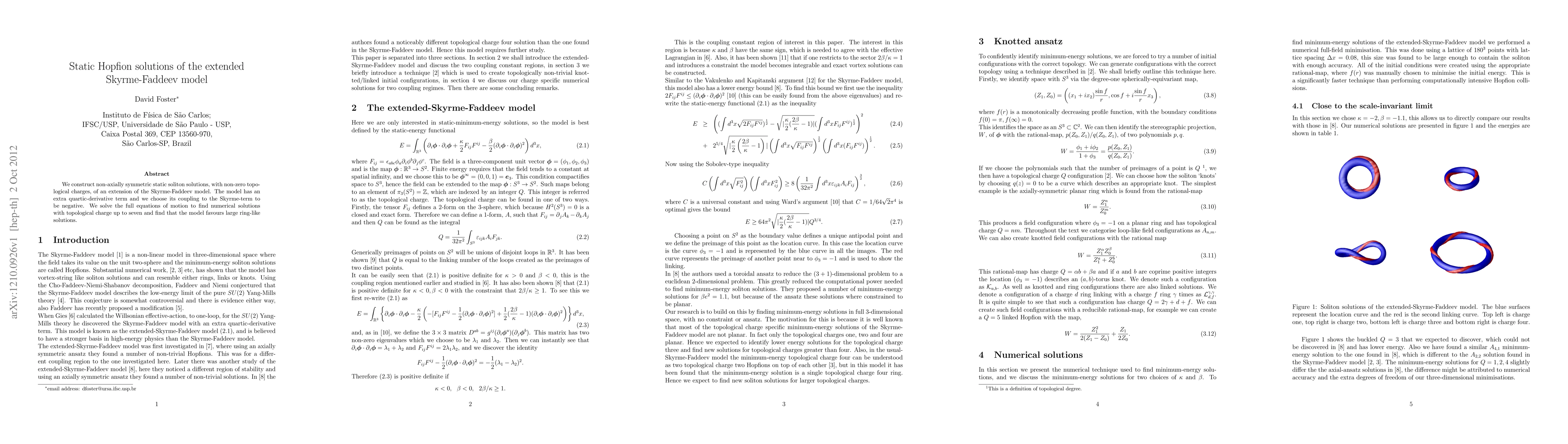 We construct non-axially symmetric static soliton solutions, with non-zero topological charges, of an extension of the Skyrme-Faddeev model. The model has an extra quartic-derivative term and we choose its coupling to the Skyrme-term to be negative. We solve the full equations of motion to find numerical solutions with topological charge up to seven and find that the model favours large ring-like solutions.