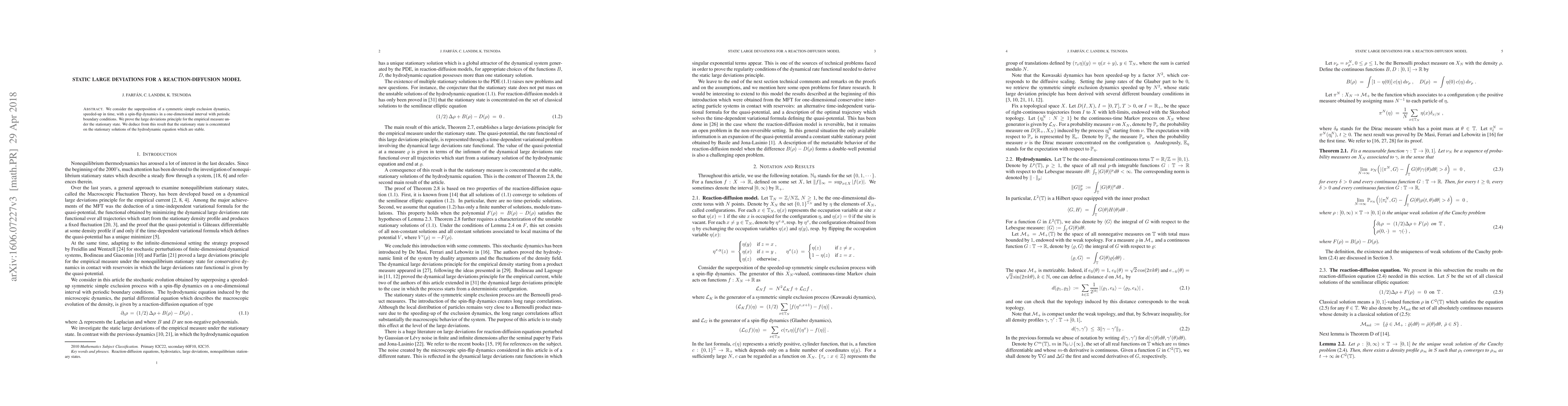 This paper proves the large deviations principle for a reaction-diffusion model combining simple exclusion dynamics and spin-flip dynamics, demonstrating that the stationary state is concentrated on stable solutions of the corresponding hydrodynamic equation.