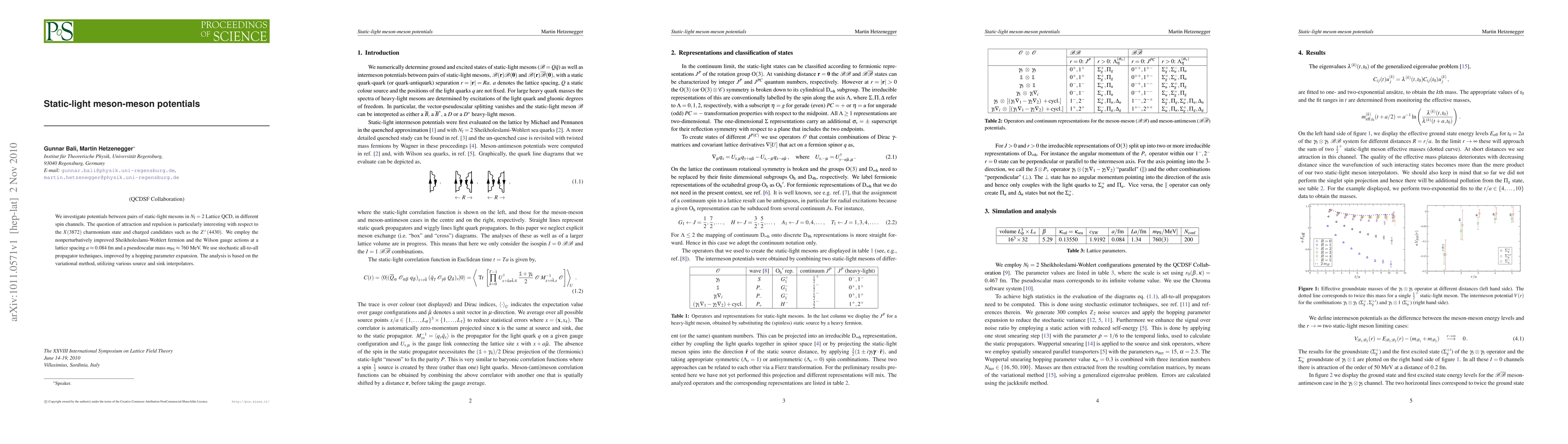 We investigate potentials between pairs of static-light mesons in Nf=2 Lattice QCD, in different spin channels. The question of attraction and repulsion is particularly interesting with respect to the X(3872) charmonium state and charged candidates such as the Z+(4430). We employ the nonperturbatively improved Sheikholeslami-Wohlert fermion and the Wilson gauge actions at a lattice spacing a approx. 0.084 fm and a pseudoscalar mass mPS approx. 760 MeV. We use stochastic all-to-all propagator techniques, improved by a hopping parameter expansion. The analysis is based on the variational method, utilizing various source and sink interpolators.