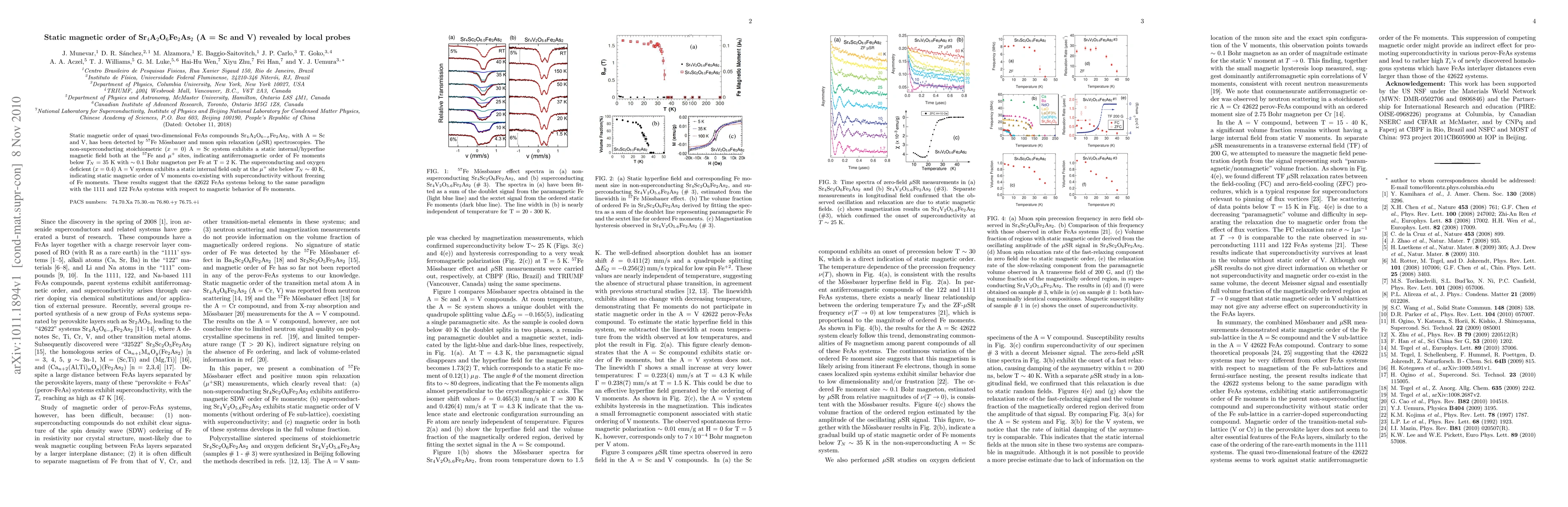 Static magnetic order of quasi two-dimensional FeAs compounds Sr4A2O6-xFe2As2, with A = Sc and V, has been detected by 57Fe Moessbauer and muon spin relaxation ({\mu}SR) spectroscopies. The non-superconducting stoichiometric (x = 0) A = Sc system exhibits a static internal/hyperfine magnetic field both at the 57Fe and {\mu}+ sites, indicating antiferromagnetic order of Fe moments below TN = 35 K with ~ 0.1 Bohr magneton per Fe at T = 2 K. The superconducting and oxygen deficient (x = 0.4) A = V system exhibits a static internal field only at the {\mu}+ site below TN ~ 40 K, indicating static magnetic order of V moments co-existing with superconductivity without freezing of Fe moments. These results suggest that the 42622 FeAs systems belong to the same paradigm with the 1111 and 122 FeAs systems with respect to magnetic behavior of Fe moments.