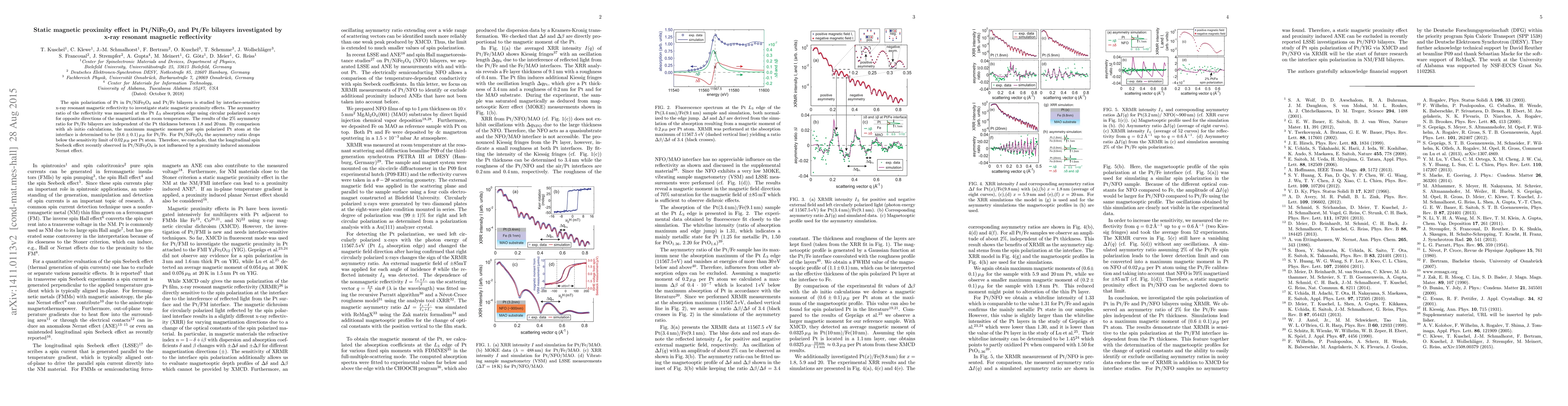 The spin polarization of Pt in Pt/NiFe2O4 and Pt/Fe bilayers is studied by interface-sensitive x-ray resonant magnetic reflectivity to investigate static magnetic proximity effects. The asymmetry ratio of the reflectivity was measured at the Pt L3 absorption edge using circular polarized x-rays for opposite directions of the magnetization at room temperature. The results of the 2% asymmetry ratio for Pt/Fe bilayers are independent of the Pt thickness between 1.8 and 20 nm. By comparison with ab initio calculations, the maximum magnetic moment per spin polarized Pt atom at the interface is determined to be $(0.6\pm0.1)\,\mu_{B}$ for Pt/Fe. For Pt/NiFe2O4 the asymmetry ratio drops below the sensitivity limit of $0.02\,\mu_{B}$ per Pt atom. Therefore, we conclude, that the longitudinal spin Seebeck effect recently observed in Pt/NiFe2O4 is not influenced by a proximity induced anomalous Nernst effect.