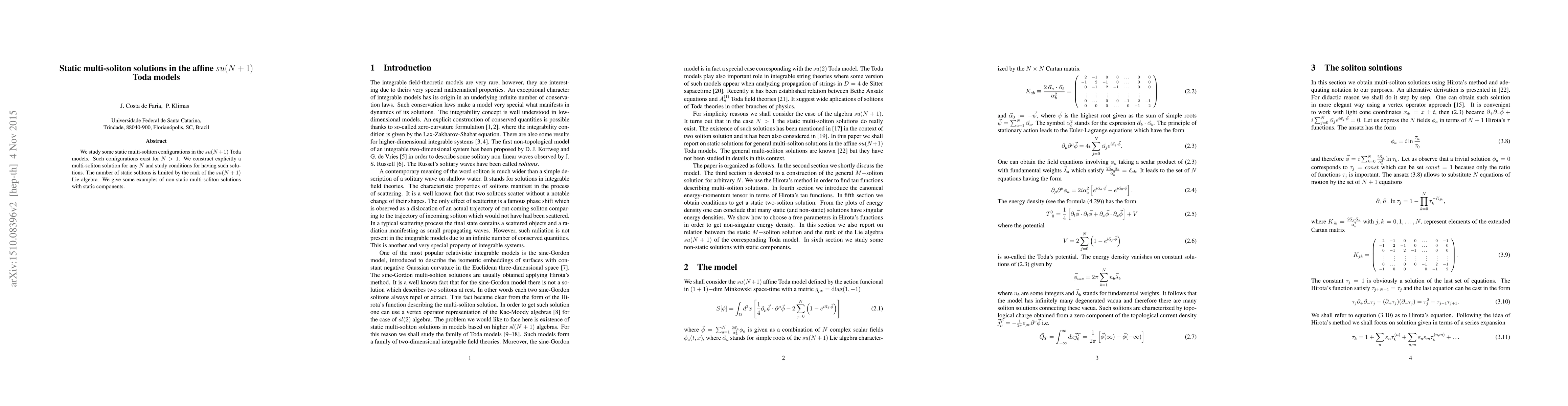 This research constructs explicit static multi-soliton solutions for the su(N+1) Toda models when N > 1, detailing the conditions under which these solutions exist and noting their limitation by the rank of the su(N+1) Lie algebra. Examples of non-static solutions with static components are also provided.