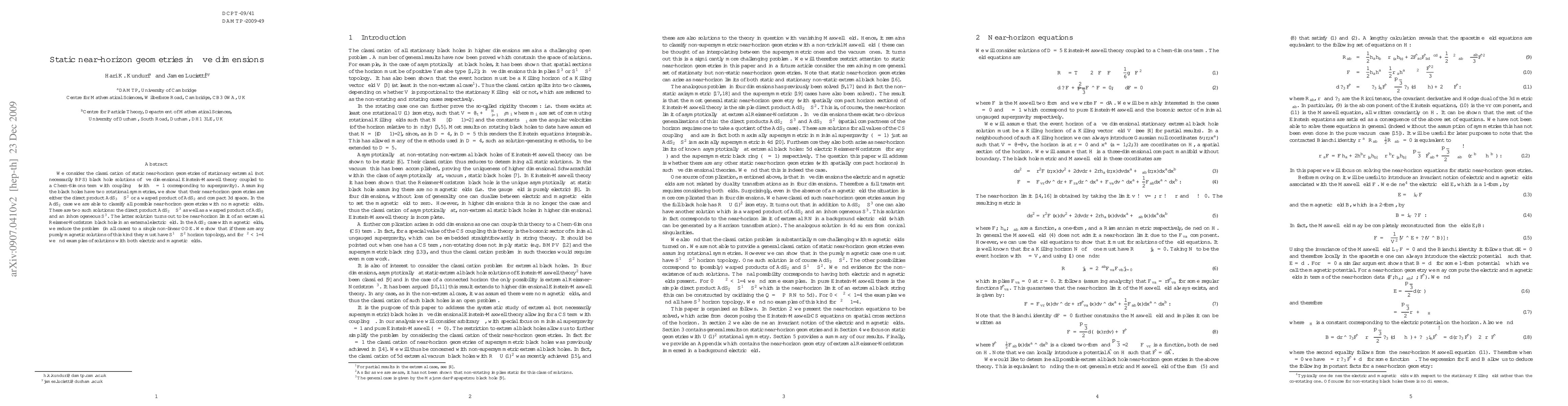 This paper classifies static near-horizon geometries of five-dimensional extremal black holes, revealing they are either AdS_3 X S^2 or a warped product involving AdS_2 and a compact 3d space. For AdS_2 cases, it identifies two solutions: AdS_2 X S^3 and a warped product resembling an inhomogeneous S^3, with the latter representing an extremal Reissner-Nordstrom black hole under an external electric field.