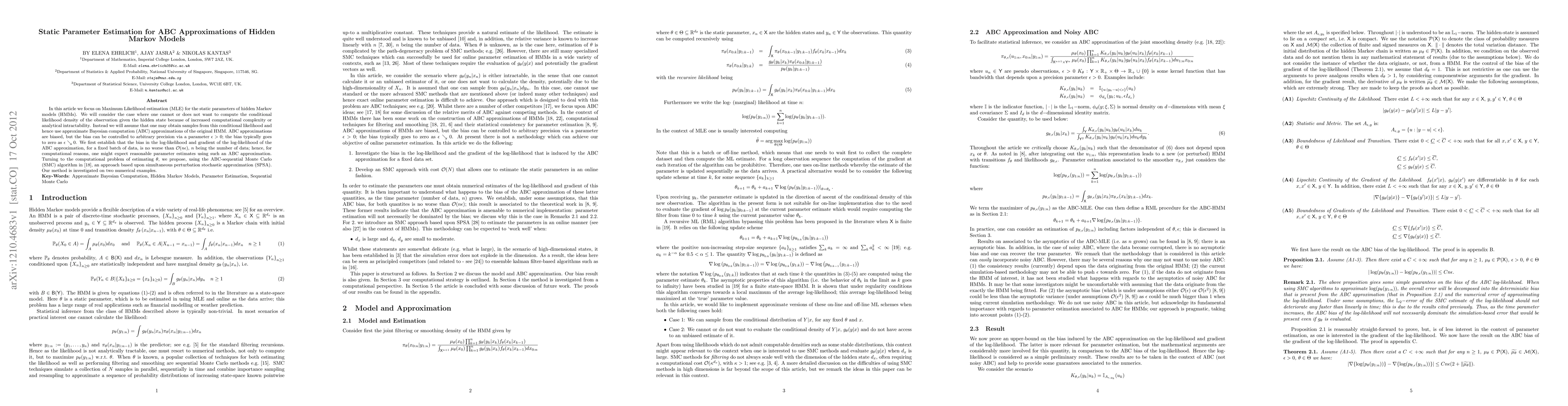 Researchers propose a method for estimating static parameters of hidden Markov models using approximate Bayesian computation (ABC) approximations to overcome computational complexity, demonstrating that the proposed approach can produce reasonable parameter estimates with controlled bias.