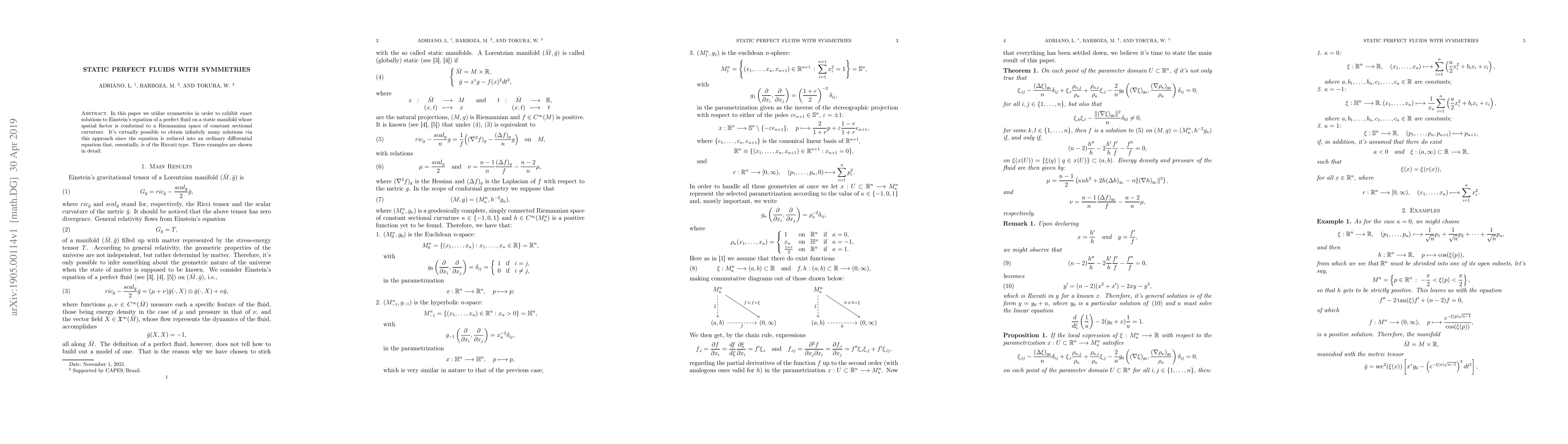 The paper utilizes symmetries to derive exact solutions for Einstein's equation of a perfect fluid on a static manifold with a spatial factor belonging to the conformal class of a Riemannian space of constant curvature.
