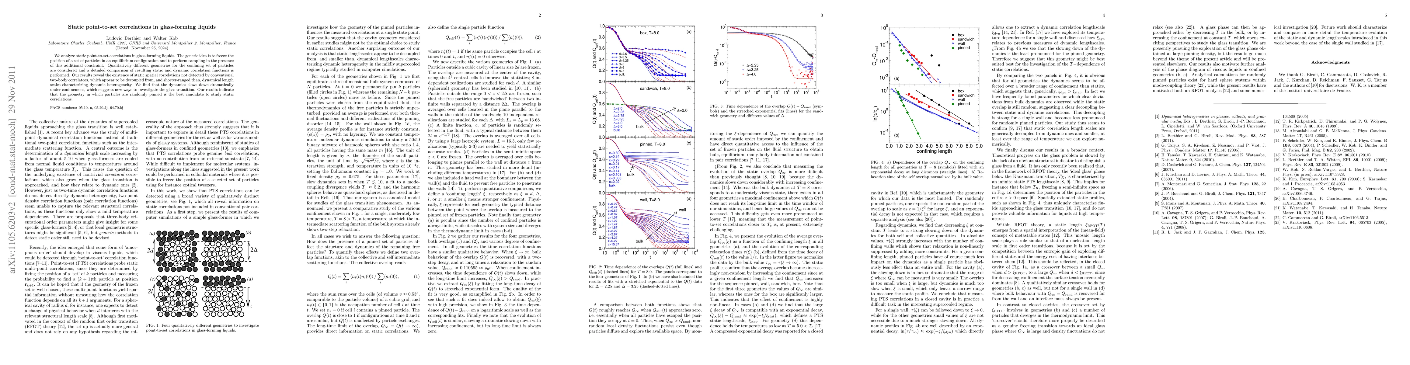 We analyze static point-to-set correlations in glass-forming liquids. The generic idea is to freeze the position of a set of particles in an equilibrium configuration and to perform sampling in the presence of this additional constraint. Qualitatively different geometries for the confining set of particles are considered and a detailed comparison of resulting static and dynamic correlation functions is performed. Our results reveal the existence of static spatial correlations not detected by conventional two-body correlators, which appear to be decoupled from, and shorter-ranged than, dynamical length scales characterizing dynamic heterogeneity. We find that the dynamics slows down dramatically under confinement, which suggests new ways to investigate the glass transition. Our results indicate that the geometry in which particles are randomly pinned is the best candidate to study static correlations.