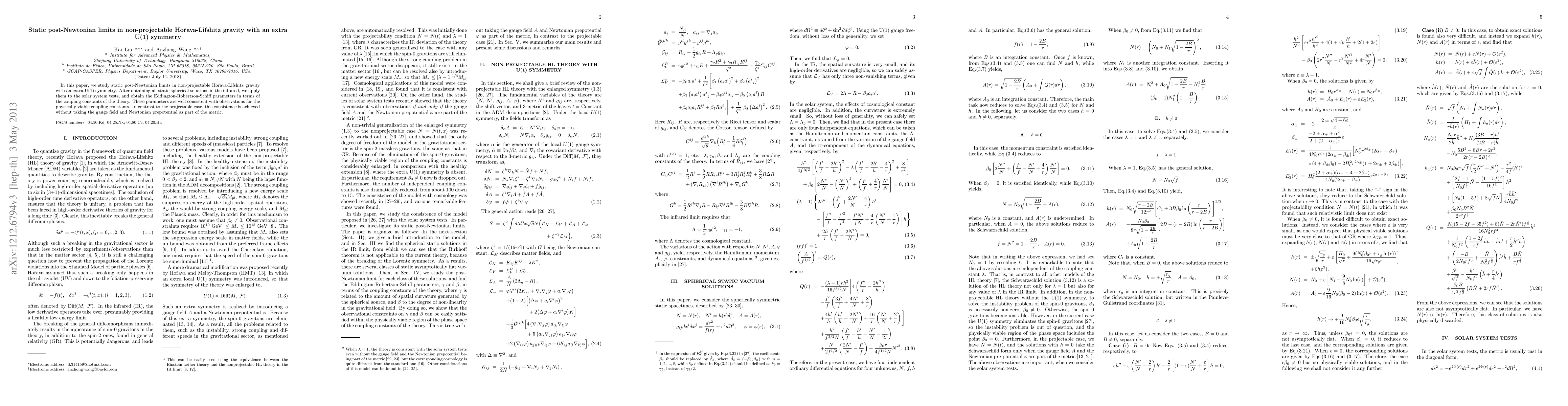 This research explores static post-Newtonian limits in non-projectable Hov{r}ava-Lifshitz gravity with added U(1) symmetry. It derives solar system test parameters from static spherical solutions in the infrared, showing consistency with observations using physically viable coupling constants, without including gauge field and Newtonian prepotential in the metric.