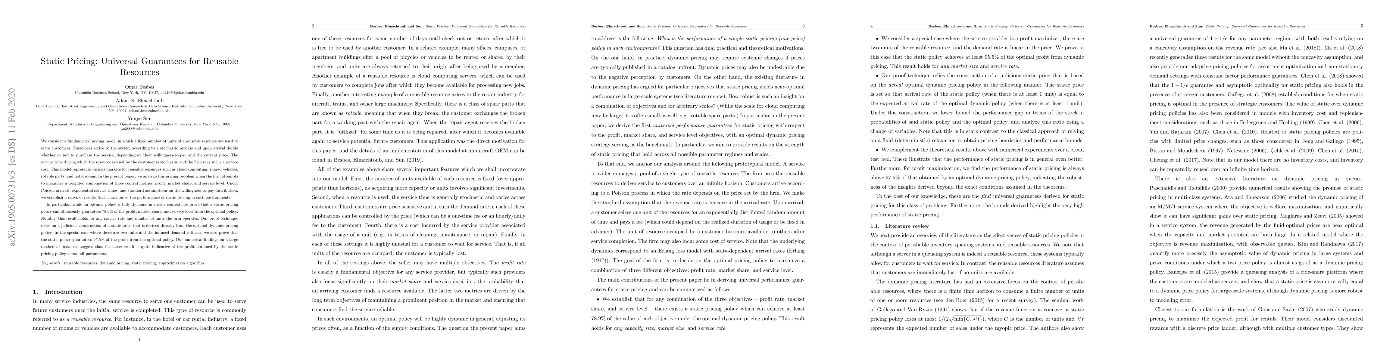 A research paper finds that a static pricing policy can guarantee 78.9% of the profit, market share, and service level from an optimal dynamic pricing policy in reusable resource markets.