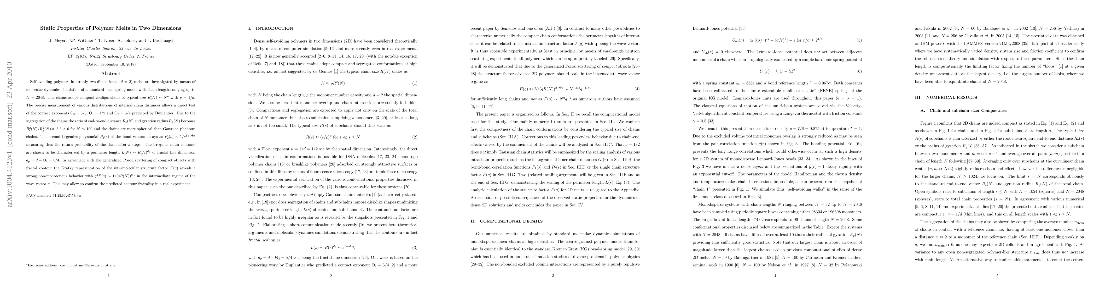 Self-avoiding polymers in strictly two-dimensional ($d=2$) melts are investigated by means of molecular dynamics simulation of a standard bead-spring model with chain lengths ranging up to N=2048. % The chains adopt compact configurations of typical size $R(N) \sim N^{\nu}$ with $\nu=1/d$. % The precise measurement of various distributions of internal chain distances allows a direct test of the contact exponents $\Theta_0=3/8$, $\Theta_1=1/2$ and $\Theta_2=3/4$ predicted by Duplantier. % Due to the segregation of the chains the ratio of end-to-end distance $\Rend(N)$ and gyration radius $\Rgyr(N)$ becomes $\Rend^2(N)/\Rgyr^2(N) \approx 5.3 < 6$ for $N \gg 100$ and the chains are more spherical than Gaussian phantom chains. % The second Legendre polynomial $P_2(s)$ of the bond vectors decays as $P_2(s) \sim 1/s^{1+\nu\Theta_2}$ measuring thus the return probability of the chain after $s$ steps. % The irregular chain contours are shown to be characterized by a perimeter length $L(N) \sim R(N)^{\dc}$ of fractal line dimension $\dc = d-\Theta_2 =5/4$. % % In agreement with the generalized Porod scattering of compact objects with fractal contour the Kratky representation of the intramolecular structure factor $F(q)$ reveals a strong non-monotonous behavior with $q^dF(q) \sim 1/(q R(N))^{\Theta_2}$ in the intermediate regime of the wave vector $q$. This may allow to confirm the predicted contour fractality in a real experiment.