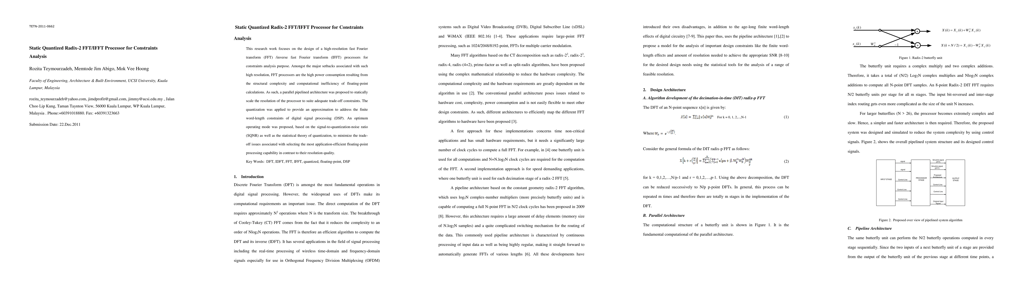 This research work focuses on the design of a high-resolution fast Fourier transform (FFT) /inverse fast Fourier transform (IFFT) processors for constraints analysis purpose. Amongst the major setbacks associated with such high resolution, FFT processors are the high power consumption resulting from the structural complexity and computational inefficiency of floating-point calculations. As such, a parallel pipelined architecture was proposed to statically scale the resolution of the processor to suite adequate trade-off constraints. The quantization was applied to provide an approximation to address the finite word-length constraints of digital signal processing (DSP). An optimum operating mode was proposed, based on the signal-to-quantization-noise ratio (SQNR) as well as the statistical theory of quantization, to minimize the tradeoff issues associated with selecting the most application-efficient floating-point processing capability in contrast to their resolution quality.