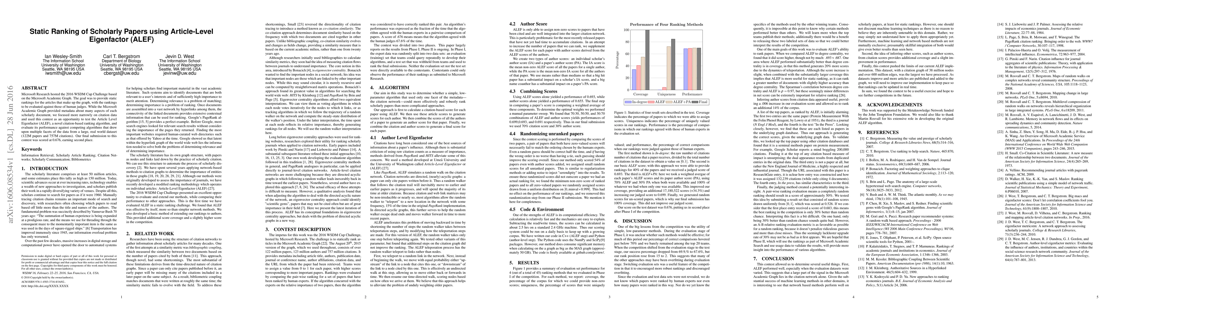 Microsoft Research hosted the 2016 WSDM Cup Challenge based on the Microsoft Academic Graph. The goal was to provide static rankings for the articles that make up the graph, with the rankings to be evaluated against those of human judges. While the Microsoft Academic Graph provided metadata about many aspects of each scholarly document, we focused more narrowly on citation data and used this contest as an opportunity to test the Article Level Eigenfactor (ALEF), a novel citation-based ranking algorithm, and evaluate its performance against competing algorithms that drew upon multiple facets of the data from a large, real world dataset (122M papers and 757M citations). Our final submission to this contest was scored at 0.676, earning second place.