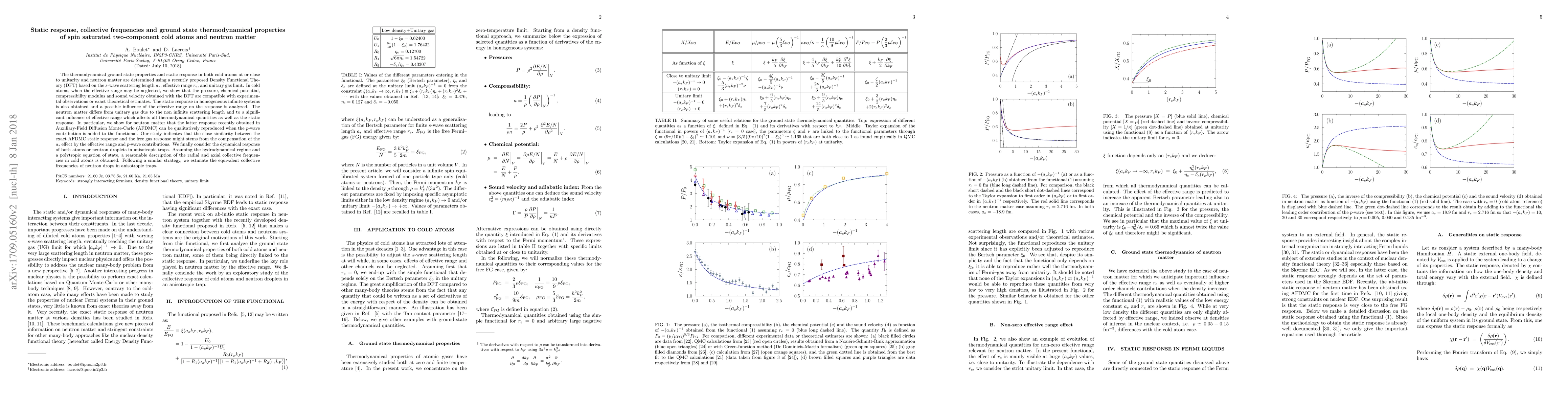The thermodynamical ground-state properties and static response in both cold atoms at or close to unitarity and neutron matter are determined using a recently proposed Density Functional Theory (DFT) based on the s-wave scattering length $a_s$, effective range $r_e$, and unitary gas limit. In cold atoms, when the effective range may be neglected, we show that the pressure, chemical potential, compressibility modulus and sound velocity obtained with the DFT are compatible with experimental observations or exact theoretical estimates. The static response in homogeneous infinite systems is also obtained and a possible influence of the effective range on the response is analyzed. The neutron matter differs from unitary gas due to the non infinite scattering length and to a significant influence of effective range which affects all thermodynamical quantities as well as the static response. In particular, we show for neutron matter that the latter response recently obtained in Auxiliary-Field Diffusion Monte-Carlo (AFDMC) can be qualitatively reproduced when the p-wave contribution is added to the functional. Our study indicates that the close similarity between the exact AFDMC static response and the free gas response might stems from the compensation of the $a_s$ effect by the effective range and p-wave contributions. We finally consider the dynamical response of both atoms or neutron droplets in anisotropic traps. Assuming the hydrodynamical regime and a polytropic equation of state, a reasonable description of the radial and axial collective frequencies in cold atoms is obtained. Following a similar strategy, we estimate the equivalent collective frequencies of neutron drops in anisotropic traps.