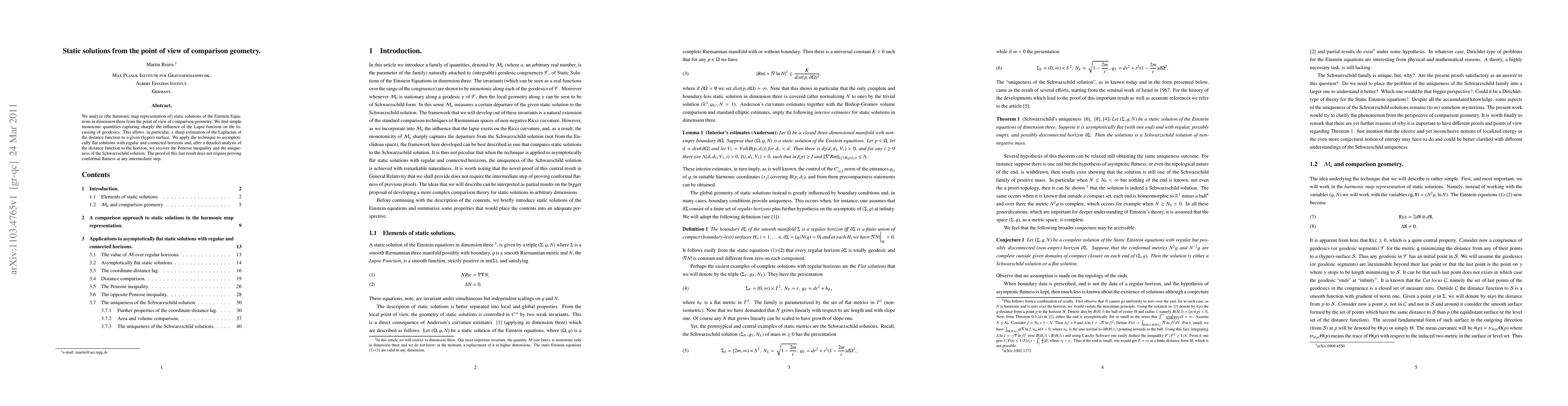 We analyze (the harmonic map representation of) static solutions of the Einstein Equations in dimension three from the point of view of comparison geometry. We find simple monotonic quantities capturing sharply the influence of the Lapse function on the focussing of geodesics. This allows, in particular, a sharp estimation of the Laplacian of the distance function to a given (hyper)-surface. We apply the technique to asymptotically flat solutions with regular and connected horizons and, after a detailed analysis of the distance function to the horizon, we recover the Penrose inequality and the uniqueness of the Schwarzschild solution. The proof of this last result does not require proving conformal flatness at any intermediate step.