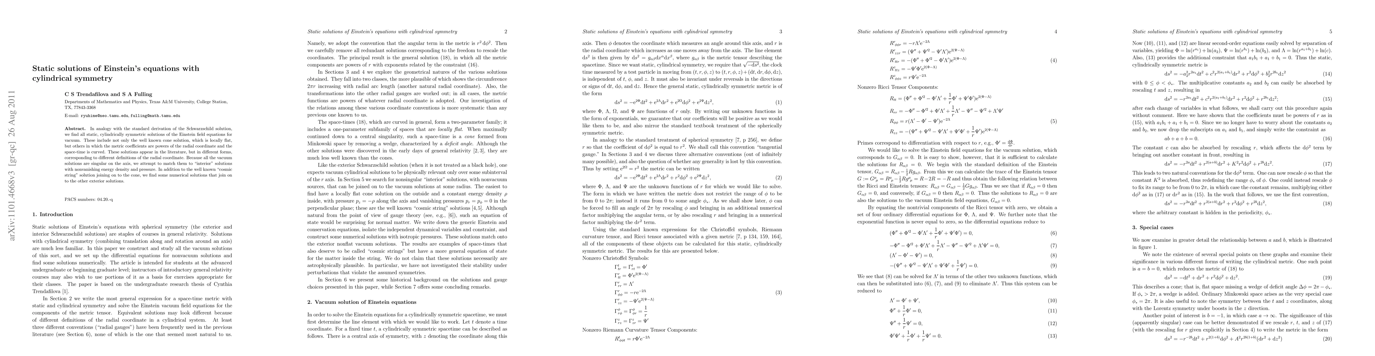 This paper identifies all static, cylindrically symmetric vacuum solutions to Einstein's field equations, including the familiar cone solution and others with curved spacetime. It also explores matching these singular solutions to interior solutions with non-zero energy density, discovering new numerical solutions akin to the cosmic string.